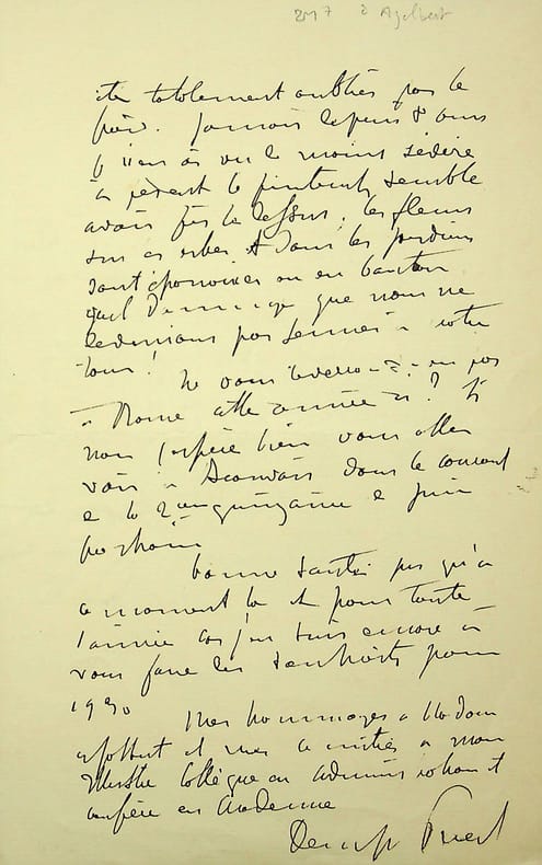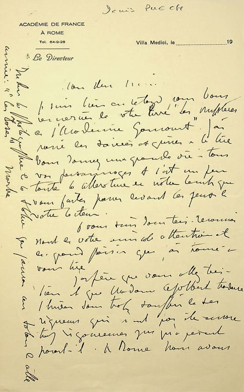 Denys Puech (1854-1942), sculpteur, grand prix de Rome 1884. L.A.S., Villa Medici, Rome, 22 décembre [1926?], 2p in-8. A l'écrivain Jean Ajalbert (1863-1947). « Mon cher ami, J'ai bien reçu votre lettre du 9 décembre et également, hier matin, vos deux volumes "La Passion de Roland Garros". J'en ai commencé la lecture le soir même : c'est [mot illisible] la vie et le mouvement et c'est bien un héros dont vous racontez la vie avec enthousiasme. Je passerai quelques soirées délicieuses à vous lire. Merci mille fois pour votre attention. Merci pour la dédicace qui me rends votre livre encore plus précieux. Puisque vous nourrissez le projet de venir à Rome au printemps prochain, je vous envoie par le même courrier la collection des Piranesi éditées du petit journal par la photographie. Cela ne pourra que vous pousser à réaliser votre projet. Il y a jusqu'à présent un peu de calme dans le mouvement des étrangers sur Rome. Les hôtels s'en plaignent amèrement. On prévoit une grande diminution des touristes. Si cela pouvait faire diminuer un peu les prix, ce serait un grand bien car la vie ici est bien chère, bien plus qu'à Paris et que dans les autres villes d'Italie dit-on. Votre idée de publier quelque chose sur l'Académie est très flatteuse pour elle. Nous ne pouvons que nous en réjouir. C'est certainement un lieu délicieux à faire connaître et à faire aimer pour que ne tardent à faire les pensionnaires qui ont la chance de vivre ici 3 ou 4 ans. Vous êtes un grand animateur. Vous l'avez montré partout où vous êtes passé. Venez donc agiter un peu l'atmosphère académique trop épaisse qui enveloppe la Villa Medici. Adieu, mon cher ami, et au plaisir de vous voir bientôt peut-être à Rome. Je joins ce souhait à tous ceux que je fais pour vous et pour madame Ajalbert à l'occasion de la nouvelle année. Denys Puech ». Petit manque de papier marginal. Belle lettre amicale. [169]