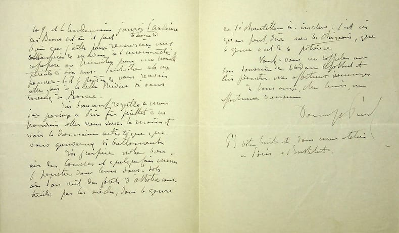 Denys Puech (1854-1942), sculpteur, grand prix de Rome 1884. L.A.S., Villa Medici, Rome, 22 décembre [1926?], 2p in-8. A l'écrivain Jean Ajalbert (1863-1947). « Mon cher ami, J'ai bien reçu votre lettre du 9 décembre et également, hier matin, vos deux volumes "La Passion de Roland Garros". J'en ai commencé la lecture le soir même : c'est [mot illisible] la vie et le mouvement et c'est bien un héros dont vous racontez la vie avec enthousiasme. Je passerai quelques soirées délicieuses à vous lire. Merci mille fois pour votre attention. Merci pour la dédicace qui me rends votre livre encore plus précieux. Puisque vous nourrissez le projet de venir à Rome au printemps prochain, je vous envoie par le même courrier la collection des Piranesi éditées du petit journal par la photographie. Cela ne pourra que vous pousser à réaliser votre projet. Il y a jusqu'à présent un peu de calme dans le mouvement des étrangers sur Rome. Les hôtels s'en plaignent amèrement. On prévoit une grande diminution des touristes. Si cela pouvait faire diminuer un peu les prix, ce serait un grand bien car la vie ici est bien chère, bien plus qu'à Paris et que dans les autres villes d'Italie dit-on. Votre idée de publier quelque chose sur l'Académie est très flatteuse pour elle. Nous ne pouvons que nous en réjouir. C'est certainement un lieu délicieux à faire connaître et à faire aimer pour que ne tardent à faire les pensionnaires qui ont la chance de vivre ici 3 ou 4 ans. Vous êtes un grand animateur. Vous l'avez montré partout où vous êtes passé. Venez donc agiter un peu l'atmosphère académique trop épaisse qui enveloppe la Villa Medici. Adieu, mon cher ami, et au plaisir de vous voir bientôt peut-être à Rome. Je joins ce souhait à tous ceux que je fais pour vous et pour madame Ajalbert à l'occasion de la nouvelle année. Denys Puech ». Petit manque de papier marginal. Belle lettre amicale. [169]
