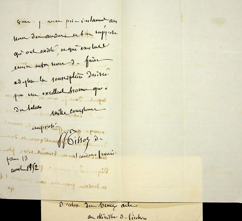 Pierre-François Tissot (1768-1854), écrivain, membre de l'Académie française. L.A.S. + enveloppe, 13 août 1852, 2p in-8. A l'écrivain, alors directeur des Beaux-arts, Auguste Romieu (1800-1855). Il le prie de recevoir Emile Agnel (1810-1882), auteur du code-manuel des artistes dramatiques et des artistes musiciens (Paris, Mansut, 1851). Un homme de talent qui mérite le soutien de Romieu. [442]