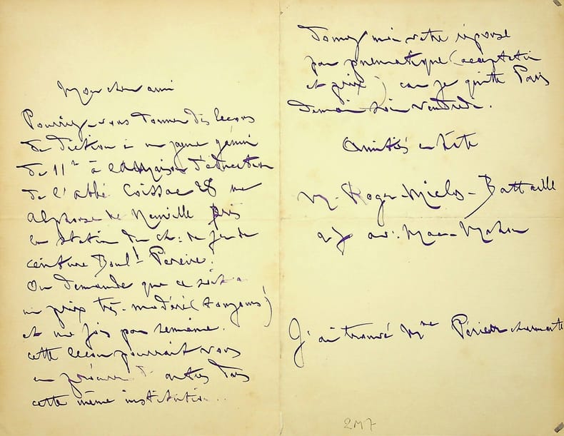 Marie-Aimée Roger-Miclos (1860-1951), pianiste. L.A.S. « M. Roger-Miclos-Battaille », sd [après 1905], 2p in-8. Elle demande à son correspondant de « donner des leçons de dictions à un jeune génie de 11 ans à la maison d'éducation de l'abbé Coissac ». [442]
