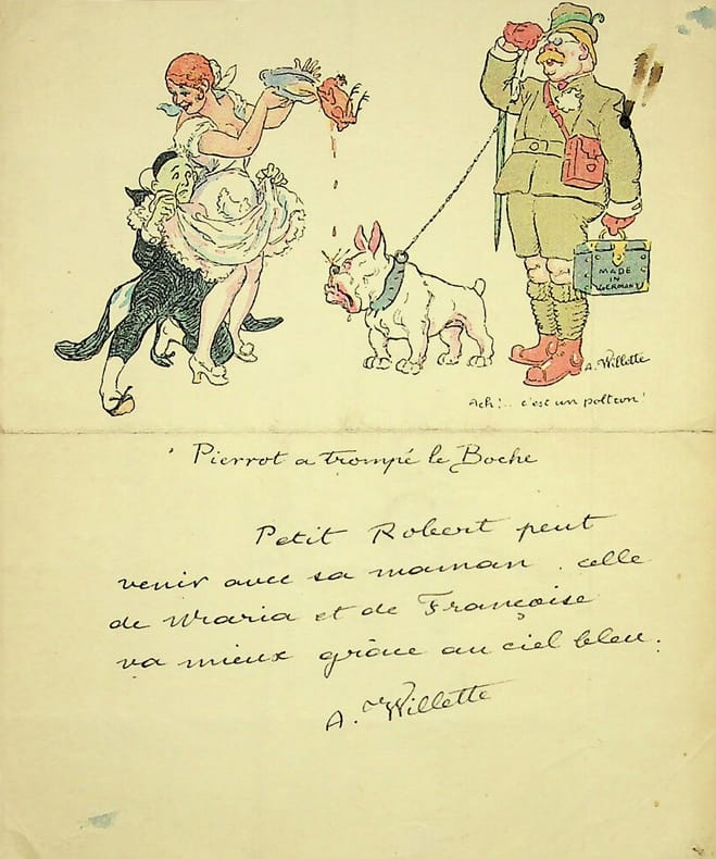 Adolphe Willette (1857-1926), peintre, illustrateur, graveur. L.A.S., sd, 1/2p in-8. Bel entête avec un dessin imprimé. « Petit Robert peut venir avec sa maman. Celle de Maria et Françoise va mieux grâce au ciel bleu. A Willette ». [442]