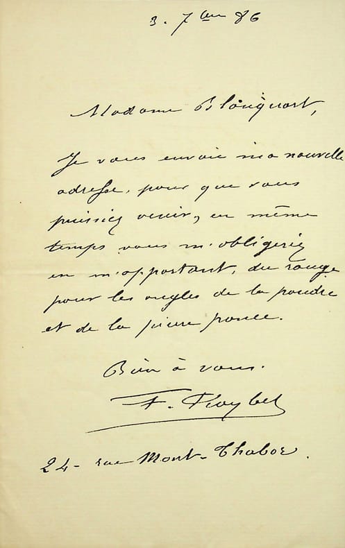 Ferdinand Roybet (1840-1920), peintre, graveur. L.A.S, 3 septembre 1886, 1P in-8. « Madame Blouquart, Je vous envoie ma nouvelle adresse pour que vous puissiez venir, en même temps vous m'obligeriez en m'apportant du rouge pour les ongles, de la poudre et de la pierre ponce. Bien à vous. F Roybet ». [442]