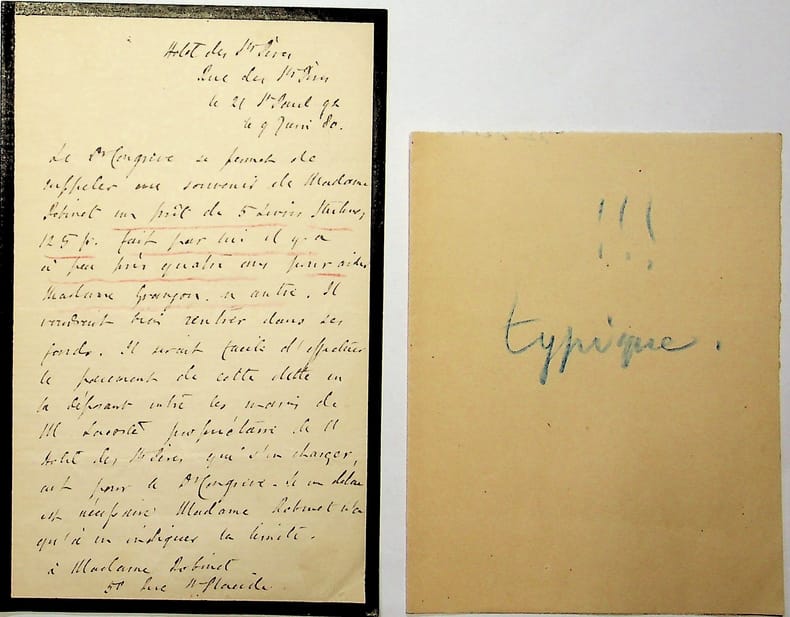 [Positivisme] Richard Congreve (1818-1899), philosophe anglais, figure de proue du positivisme en Angleterre, à l'origine du schisme en 1878. L.A.S. en français et à la troisième personne, 21 Saint Paul 92 [9 juin 1880], 1p in-8. A Marie Weyer (1827-1881), épouse du docteur Jean-François Robinet (1825-1899), médecin d'Auguste Comte et important positiviste français. « Le Dr Congreve se permet de rappeler au souvenir de Madame Robinet un prêt de 5 livres sterling fait par lui il y a à peu près quatre ans pour aider madame Granjon ou autre. Il voudrait bien rentrer dans ses fonds. Il serait surtout facile d'effectuer le paiement de cette dette en la déposant entre les mains de M. Lacoste propriétaire de l'hôtel des Saints Pères qui s'en chargerait pour le Dr Congreve. Si un délai est nécessaire, Madame Robinet n'a qu'à en indiquer la limite ». Léopold Auguste Granjon (1845-1875) est un ouvrier, militant ouvrier, franc-maçon et positiviste, membre du cercle des prolétaires positivistes. Il meurt donc en laissant son épouse Constance Friant (1843-?) qui avait donc été aidée par les positivistes. Les lettres entre positivistes sont rares. [443]