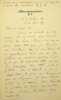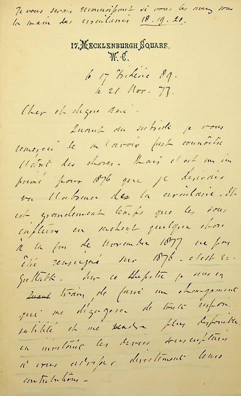 Edward Spencer Beesly (1831-1915), philosophe anglais, historien, militant syndical, positiviste. Elève de Richard Congreve, il rompt lors du schisme de 1878 et dirigera la London positivist Society. L.A.S., 25 César 91 [17 mai 1879], 4p in-8. Au docteur Jean-François Robinet (1825-1899), médecin d'Auguste Comte et important positiviste français. « Cher Docteur Robinet, J'étais sûr & j'ai prédit que M. Congreve en allant à Paris s'efforcerait de rétablir des relations amicales avec le monde positiviste, vous & votre famille exceptés, & qu'il tâcherait de réduire les proportions de la scission à une querelle personnelle entre vous & lui. J'étais sûr que le succès - du reste assez médiocre - qu'il a obtenu en Angleterre ne compenserait à ses yeux en aucune façon la perte entière de la considération dont il jouissait autrefois à Paris. Voilà pourquoi il affiche tant de modération. Sa proposition de contribuer aux deux sommes du subside m'est suspect. Il prétend établir une distribution entre le revenu affecté aux frais de l'exécution testamentaire et le subside sacerdotal de M. Laffitte. Ainsi d'une part il acquerrait le droit - au moins moral - d'intervenir dans la gestion de l'appartement d'Auguste Comte, et de l'autre il aurait l'air de constituer M. Laffitte en pensionnaire pour une somme variable. Selon moi, le plus sûr c'est de refuser toute condition ou explication. Si M. Congreve veut contribuer une somme grande ou petite, qu'elle soit acceptée comme toute autre contribution, sans aucune obligation de l'affecter à tel ou tel dépens. Il ne faut pas prendre la moindre note d'aucune déclaration qu'il pourra faire à cet égard et surtout il faut attendre d'an en an la cessation abrupte de ce don, et d'employer tous nos efforts pour augmenter le nombre des souscripteurs au subside. Je n'ai jamais vu la réponse de M. Congreve à votre lettre collective. Quelle était "l'hypothèse" et "les termes dont il s'est servi" ? Je vous félicite tous sur la fermeté de votre attitude. Adieu cher & honoré confrère. Veuillez présenter mes hommages affectueux à madame Robinet. E.S. Beesly. Dans le "résumé général des souscriptions", la somme contribuée par M. Congreve doit rentrer dans la masse de "occidentales" dont elle constituerait naturellement le "maximum". On ne doit pas lui accorder aucune mention spéciale ». Les lettres entre positivistes sont rares. [447]