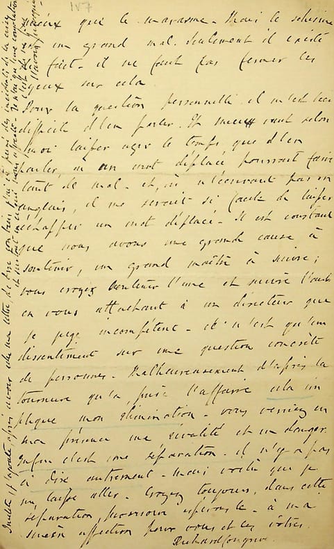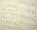 [Positivisme] Richard Congreve (1818-1899), philosophe anglais, figure de proue du positivisme en Angleterre, à l'origine du schisme en 1878 ; Mary Bury Congreve (1833-1915), épouse du philosophe ; Emily Bury Geddes (1840-1929), soeur de Mary ; James Geddes (1841-1880), époux d'Emily. L.A.S. de Mary Congreve en français & L.A.S. de Richard Congreve en françaisn contre signée par Emily et James Geddes, 15-16 Moïse 90 [15-16 janvier 1878], 6p in-8. A Mary Weyer Robinet (1827-1881), épouse du docteur Jean-François Robinet (1825-1899), médecin d'Auguste Comte et important positiviste français. « Ma chère amie, En recevant votre lettre, j'ai regretté plus que je ne saurais vous dire d'avoir tant ajourné la réponse que je vous avais, je crois, promise dans une lettre à Virginie, et qu'elle en doit pas avoir lue il me semble ou avoir interprétée dans la même manière que vous. Ayez la bonté de vérifier cela, car cela vous convaincrait que je n'ai aucunement désiré une séparation ou cessation stricte de correspondance. Pour éviter toute méprise, je la prie de me la renvoyer si elle l'a scellée jusqu'ici. Je la lui renverrais si elle veut. Je me reposais sur ce que vous me disiez dans votre bonne lettre de nouvel an où vous me dites : "Si je ne vous ai pas écrit dans ces derniers temps, c'est que je n'ai pas su avec quel désir de liberté je pouvais le faire sans blesser vos sentiments personnes" et puisque vous me parlez de souffrances, du reste je l'avais désiré, vous ne devez pas être surprise que, ne l'étant pas je crois moins, je ressentis de la peine à répondre simplement[?]. Mais je me serais épargné encore une douleur si j'y avais mis plus de promptitude. Ce que j'allais vous dire vous aurait peut-être empêchée de m'écrire sur ce sujet, ce qui eût été mieux pour toutes les deux. Car évidemment, situées comme nous sommes, les mesures étant dans d'autres mains, la meilleure chose que nous avons à faire, c'est de garder le contact[?] autant que possible et de fortifier[?] nos affections sans laisser aveugler notre jugement, voilà ce que j'entendais par mon amitié subjective pour ainsi dire - réelle autant que vous voulez, mais ne se permettant pas de visiter les choses présentes qui nous intéressent - peut-être trop. Et vous me parle de votre projet comme si le but de cette entrevue Boulevard dde la Madeleine n'était pas que M. Robinet nous exposât les raisons d'une démarche qu'il désirait tant, disait-il, pour le positivisme (il n'a presque pas été question de nos personnalités mais de nos devoirs-sacrifices a-t-il dit) et qui me répugnent tant à moi - démarche dont les inconvénients qu'il regrettait en [mot illisible] était surtout pour nous dans le cas que M. Laffitte ne se résignerait pas (ce que vous avez, vous et lui, dit qu'il ferait probablement). Que son affection pour M. Laffitte était profonde, cela se voyait, et qui a ajouté un grand poids à sa désapprobation de la directions, mais c'était comme moyen d'éviter un schisme, que M. Robinet a insisté sur notre venue et c'était en vue de ce schisme, qu'il ne contemplait que dans le cas que M. Congreve se refuserait de venir à Paris que M. Robinet, vous aussi je crois, vous avez dit que vous resteriez du côté de M. Laffitte. C'était nous, au contraire, qui nous sommes alors, comme plus tard, opposés à l'espèce de substitution sourde que vous avez désirée, et qui ne nous a pas parue désirer de mon mari. Aucune déclaration que M. Robinet se rangerait du côté de M. Laffitte si, mon mari venant, les choses [mot illisible] mal, n'a été faite. Il y a eu, je crois, confusion dans votre mémoire entre cette entrevue et la correspondance des dernières semaines de l'an passé. Dans la première, il n'y avait rien qui aurait pu nous blesser ni dans les expressions que je vous cite de la chose que vous avez écrite à M. Congreve beaucoup plus tard - elle est datée le 27 Descartes 89. "Il est pour moi hors de doute que votre présence à Paris serait le salut du Positivisme et la seule