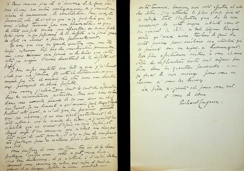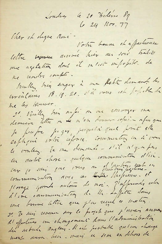 [Positivisme] Richard Congreve (1818-1899), philosophe anglais, figure de proue du positivisme en Angleterre, à l'origine du schisme en 1878. L.A.S. en français, Londres, 20 Frédéric 89 [24 novembre 1877], 4p 1/2 in-8. Au docteur Jean-François Robinet (1825-1899), médecin d'Auguste Comte et important positiviste français. « Cher et digne ami, Votre bonne et affectueuse lettre arrivée hier au soir trahit une agitation dont il m'est impossible de me rendre complète[ment]. Veuillez bien songer à ma petite demande des circulaires 18.19.20 s'il vous est possible de me les trouver. 2° Veuillez bien aussi ou me renvoyer ma dernière lettre ou m'en donner copie afin que je puisse juger jusqu'à quel point elle explique votre réponse. Commentez la si vous voulez. Je me demande s'il n'y a pas eu autre chose - quelque communication d'ici - car je sais que vous ou d'autres, c'est bien légitime, sont en communication avec ces Messieurs et l'orage gronde autour de moi. J'apprends cela d'une communication de M. [Pierre] Laffitte dans une bonne lettre que j'ai reçue ce matin. 3° je suis revenu sur le projet que j'avais annoncé d'effectuer un changement dans l'administration du subside anglais. Il est possible qu'un changement aura lieu mais ce sera en dehors de mon initiation[?]. Le projet avait ses avantages mais je reconnais que ce n'est pas le moment d'y penser. 4° Je prends d'abord votre postscriptum. Je n'ai jamais parlé de retraite.Où avez-vous pris cela. Tout au contraire, je cherche par tous les moyens d'agrandir la sphère de mon activité. Si par hasard, il m'arrivait de me voir abandonné par la presque totalité de mes confrères anglais, ou d'avoir à les quitter, je continuerais toujours de lutter comme auparavant. Il y a vingt-deux ans que j'ai commencé seul. Je suis prêt à recommencer non pas seul mais bien isolé, dans un cercle bien restreint mais peut-être aussi utile que celui qui existe. Et je compte réussir avec l'aide de certains appuis à un certain degré. Ma situation à Londres peut être essentielle - honorée peut-être - mais elle sera, je le crains, ébranlée sous peu par l'action de ces messieurs. Mais en tout état de cause, si ma carrière est brisée, cela ne dépendra pas de moi mais de l'action extérieure. et j'aurais la consolation de voir que cette action extérieure aura développé l'énergie de ceux qui la prendront - une énergie en somme utile à la Religion de l'Humanité. Ainsi, cher ami, je pense que vous serez calmé quant à ma détermination. J'ai rédigé une longue lettre à M. Laffitte que je vais soumettre à certains amis. Elle vous expliquera mon point de vue et cela m'a trop coûté pour que j'y revienne en détail. En attendant, je lui ai répondu ce matin. Maintenant je réponds à votre lettre. Vous avez senti un refroidissement - et vous avec eu raison. À quoi tient-il ? Libre à vous de vous ranger du côté de M. Laffitte, de juger que le statu quo amélioré était le seul admissible. Je puis différer mais enfin votre avis avait beaucoup eu sa faveur. Mais, après tout ce qui s'est passé entre nous, j'ai été choqué de la manière dont vous m'avez présenté l'action de M. Laffitte et aussi de la manière dont préoccupé du soin de me détourné de toute opposition, vous avez interprété mon action. Mais c'était long, et peut-être impossible de débrouiller des difficultés pareilles. (Je remarque en passant que la Fête de l'Humanité n'est pas proprement parlant une fête commémorative d'Auguste Comte - encore moins de sa naissance). Si vous m'aviez dit, je le crois de bonne politique de soutenir M. Laffitte, puisque il faut choisir, je n'aurais eu rien à dire. Votre jugement sur lui m'aurait paru peu conciliable, peut-être, avec cette conclusion. Mais voilà tout. Mais l'argumentation m'a déplu. Je vous l'avoue franchement. Ensuite, quant à ma venue, dans les conditions telles que vous les aviez "rêvées", elle devait avoir envie à une époque plus ou moins éloignée de me substituer à M. Laffitte. Mais dans vis der