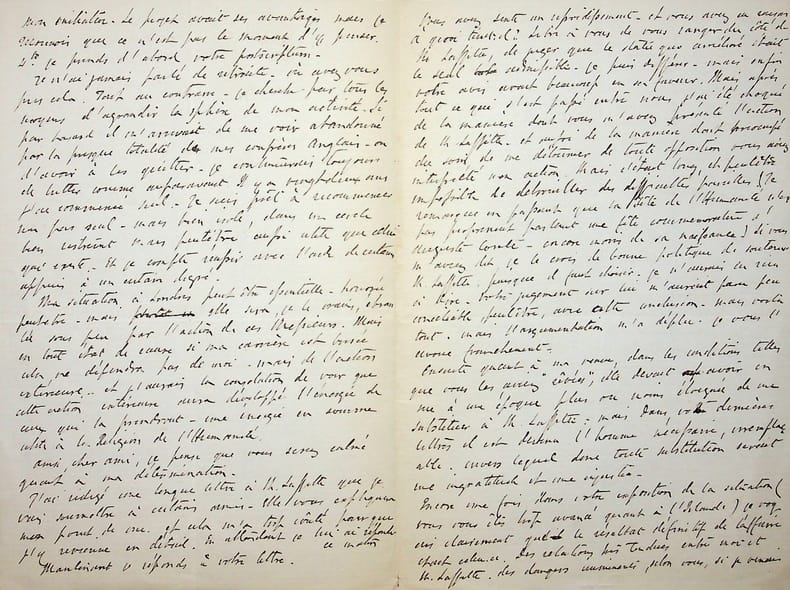 [Positivisme] Richard Congreve (1818-1899), philosophe anglais, figure de proue du positivisme en Angleterre, à l'origine du schisme en 1878 ; Mary Bury Congreve (1833-1915), épouse du philosophe ; Emily Bury Geddes (1840-1929), soeur de Mary ; James Geddes (1841-1880), époux d'Emily. L.A.S. de Mary Congreve en français & L.A.S. de Richard Congreve en françaisn contre signée par Emily et James Geddes, 15-16 Moïse 90 [15-16 janvier 1878], 6p in-8. A Mary Weyer Robinet (1827-1881), épouse du docteur Jean-François Robinet (1825-1899), médecin d'Auguste Comte et important positiviste français. « Ma chère amie, En recevant votre lettre, j'ai regretté plus que je ne saurais vous dire d'avoir tant ajourné la réponse que je vous avais, je crois, promise dans une lettre à Virginie, et qu'elle en doit pas avoir lue il me semble ou avoir interprétée dans la même manière que vous. Ayez la bonté de vérifier cela, car cela vous convaincrait que je n'ai aucunement désiré une séparation ou cessation stricte de correspondance. Pour éviter toute méprise, je la prie de me la renvoyer si elle l'a scellée jusqu'ici. Je la lui renverrais si elle veut. Je me reposais sur ce que vous me disiez dans votre bonne lettre de nouvel an où vous me dites : "Si je ne vous ai pas écrit dans ces derniers temps, c'est que je n'ai pas su avec quel désir de liberté je pouvais le faire sans blesser vos sentiments personnes" et puisque vous me parlez de souffrances, du reste je l'avais désiré, vous ne devez pas être surprise que, ne l'étant pas je crois moins, je ressentis de la peine à répondre simplement[?]. Mais je me serais épargné encore une douleur si j'y avais mis plus de promptitude. Ce que j'allais vous dire vous aurait peut-être empêchée de m'écrire sur ce sujet, ce qui eût été mieux pour toutes les deux. Car évidemment, situées comme nous sommes, les mesures étant dans d'autres mains, la meilleure chose que nous avons à faire, c'est de garder le contact[?] autant que possible et de fortifier[?] nos affections sans laisser aveugler notre jugement, voilà ce que j'entendais par mon amitié subjective pour ainsi dire - réelle autant que vous voulez, mais ne se permettant pas de visiter les choses présentes qui nous intéressent - peut-être trop. Et vous me parle de votre projet comme si le but de cette entrevue Boulevard dde la Madeleine n'était pas que M. Robinet nous exposât les raisons d'une démarche qu'il désirait tant, disait-il, pour le positivisme (il n'a presque pas été question de nos personnalités mais de nos devoirs-sacrifices a-t-il dit) et qui me répugnent tant à moi - démarche dont les inconvénients qu'il regrettait en [mot illisible] était surtout pour nous dans le cas que M. Laffitte ne se résignerait pas (ce que vous avez, vous et lui, dit qu'il ferait probablement). Que son affection pour M. Laffitte était profonde, cela se voyait, et qui a ajouté un grand poids à sa désapprobation de la directions, mais c'était comme moyen d'éviter un schisme, que M. Robinet a insisté sur notre venue et c'était en vue de ce schisme, qu'il ne contemplait que dans le cas que M. Congreve se refuserait de venir à Paris que M. Robinet, vous aussi je crois, vous avez dit que vous resteriez du côté de M. Laffitte. C'était nous, au contraire, qui nous sommes alors, comme plus tard, opposés à l'espèce de substitution sourde que vous avez désirée, et qui ne nous a pas parue désirer de mon mari. Aucune déclaration que M. Robinet se rangerait du côté de M. Laffitte si, mon mari venant, les choses [mot illisible] mal, n'a été faite. Il y a eu, je crois, confusion dans votre mémoire entre cette entrevue et la correspondance des dernières semaines de l'an passé. Dans la première, il n'y avait rien qui aurait pu nous blesser ni dans les expressions que je vous cite de la chose que vous avez écrite à M. Congreve beaucoup plus tard - elle est datée le 27 Descartes 89. "Il est pour moi hors de doute que votre présence à Paris serait le salut du Positivisme et la seule