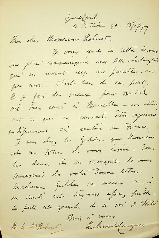 [Positivisme] Richard Congreve (1818-1899), philosophe anglais, figure de proue du positivisme en Angleterre, à l'origine du schisme en 1878 ; Mary Bury Congreve (1833-1915), épouse du philosophe ; Emily Bury Geddes (1840-1929), soeur de Mary ; James Geddes (1841-1880), époux d'Emily. L.A.S. de Mary Congreve en français & L.A.S. de Richard Congreve en françaisn contre signée par Emily et James Geddes, 15-16 Moïse 90 [15-16 janvier 1878], 6p in-8. A Mary Weyer Robinet (1827-1881), épouse du docteur Jean-François Robinet (1825-1899), médecin d'Auguste Comte et important positiviste français. « Ma chère amie, En recevant votre lettre, j'ai regretté plus que je ne saurais vous dire d'avoir tant ajourné la réponse que je vous avais, je crois, promise dans une lettre à Virginie, et qu'elle en doit pas avoir lue il me semble ou avoir interprétée dans la même manière que vous. Ayez la bonté de vérifier cela, car cela vous convaincrait que je n'ai aucunement désiré une séparation ou cessation stricte de correspondance. Pour éviter toute méprise, je la prie de me la renvoyer si elle l'a scellée jusqu'ici. Je la lui renverrais si elle veut. Je me reposais sur ce que vous me disiez dans votre bonne lettre de nouvel an où vous me dites : "Si je ne vous ai pas écrit dans ces derniers temps, c'est que je n'ai pas su avec quel désir de liberté je pouvais le faire sans blesser vos sentiments personnes" et puisque vous me parlez de souffrances, du reste je l'avais désiré, vous ne devez pas être surprise que, ne l'étant pas je crois moins, je ressentis de la peine à répondre simplement[?]. Mais je me serais épargné encore une douleur si j'y avais mis plus de promptitude. Ce que j'allais vous dire vous aurait peut-être empêchée de m'écrire sur ce sujet, ce qui eût été mieux pour toutes les deux. Car évidemment, situées comme nous sommes, les mesures étant dans d'autres mains, la meilleure chose que nous avons à faire, c'est de garder le contact[?] autant que possible et de fortifier[?] nos affections sans laisser aveugler notre jugement, voilà ce que j'entendais par mon amitié subjective pour ainsi dire - réelle autant que vous voulez, mais ne se permettant pas de visiter les choses présentes qui nous intéressent - peut-être trop. Et vous me parle de votre projet comme si le but de cette entrevue Boulevard dde la Madeleine n'était pas que M. Robinet nous exposât les raisons d'une démarche qu'il désirait tant, disait-il, pour le positivisme (il n'a presque pas été question de nos personnalités mais de nos devoirs-sacrifices a-t-il dit) et qui me répugnent tant à moi - démarche dont les inconvénients qu'il regrettait en [mot illisible] était surtout pour nous dans le cas que M. Laffitte ne se résignerait pas (ce que vous avez, vous et lui, dit qu'il ferait probablement). Que son affection pour M. Laffitte était profonde, cela se voyait, et qui a ajouté un grand poids à sa désapprobation de la directions, mais c'était comme moyen d'éviter un schisme, que M. Robinet a insisté sur notre venue et c'était en vue de ce schisme, qu'il ne contemplait que dans le cas que M. Congreve se refuserait de venir à Paris que M. Robinet, vous aussi je crois, vous avez dit que vous resteriez du côté de M. Laffitte. C'était nous, au contraire, qui nous sommes alors, comme plus tard, opposés à l'espèce de substitution sourde que vous avez désirée, et qui ne nous a pas parue désirer de mon mari. Aucune déclaration que M. Robinet se rangerait du côté de M. Laffitte si, mon mari venant, les choses [mot illisible] mal, n'a été faite. Il y a eu, je crois, confusion dans votre mémoire entre cette entrevue et la correspondance des dernières semaines de l'an passé. Dans la première, il n'y avait rien qui aurait pu nous blesser ni dans les expressions que je vous cite de la chose que vous avez écrite à M. Congreve beaucoup plus tard - elle est datée le 27 Descartes 89. "Il est pour moi hors de doute que votre présence à Paris serait le salut du Positivisme et la seule