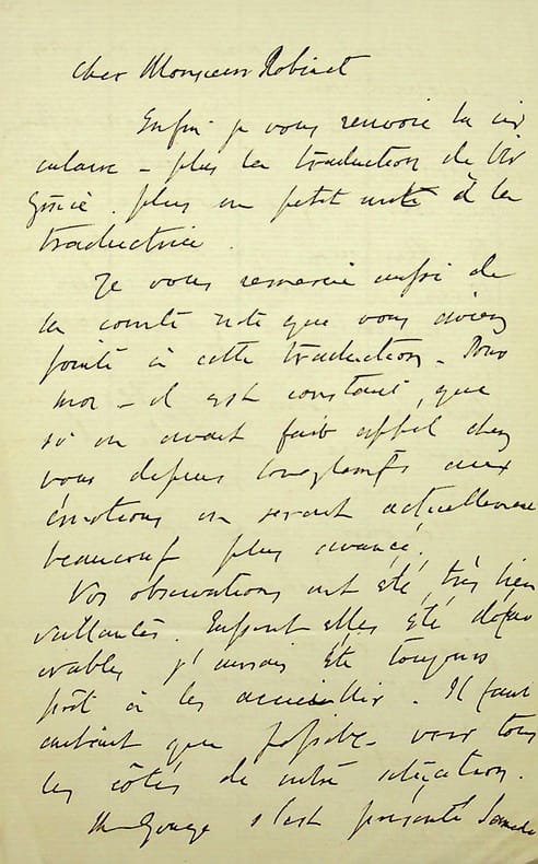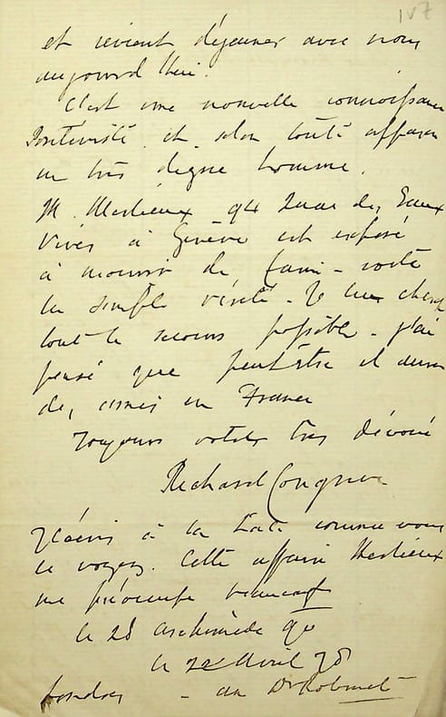 [Positivisme] Richard Congreve (1818-1899), philosophe anglais, figure de proue du positivisme en Angleterre, à l'origine du schisme en 1878. L.A.S. en français, Londres, 28 Archimède 90 [22 avril 1878], 2p in-8. Au docteur Jean-François Robinet (1825-1899), médecin d'Auguste Comte et important positiviste français. « Cher Monsieur Robinet, Enfin je vous renvoie la circulaire - plus la traduction de Mrs [nom illisible]. Plus un petit mot de la traductrice. Je vous remercie aussi de la courte note que vous aviez jointe à cette traduction. Pour moi, il est constant, que si on avait fait appel chez vous depuis longtemps aux émotions, on serait actuellement beaucoup plus avancé. Vos observations ont été très bienveillantes. Eussent-elles été défavorables, j'aurais été toujours prêt à les accueillir. Il faut, autant que possible, voir tous les côtés de votre situation. M. Gouge s'est présenté samedi et revient déjeuner avec nous aujourd'hui. C'est une nouvelle connaissance positiviste et, selon toute apparence, un très digne homme. M. Merlieux, 94 Quai des Eaux Vives à Genève est exposé à mourir de faim. Voilà la simple vérité. Je lui cherche tout le secours possible. J'ai pensé que peut-être il aura des amis en France. Richard Congreve. J'écris à la hâte comme vous le voyez. Cette affaire Merlieux me préoccupe beaucoup ». Auguste Gouge (1849-1937) est un ingénieur, fabricant de bronzes. Les lettres entre positivistes sont rares. [445]