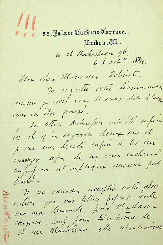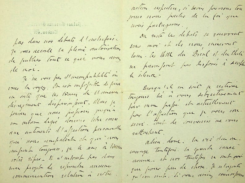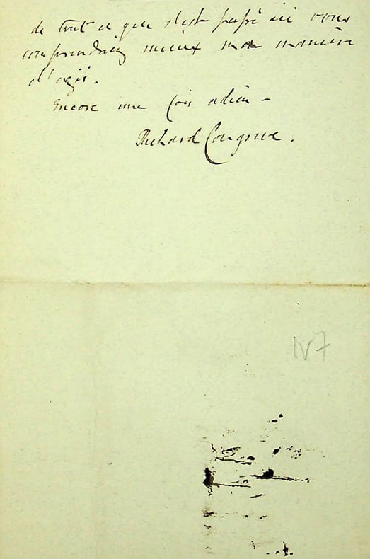 [Positivisme] Richard Congreve (1818-1899), philosophe anglais, figure de proue du positivisme en Angleterre, à l'origine du schisme en 1878. L.A.S. en français, Londres, 28 Shakespeare 96 [6 octobre 1884], 3p Œ in-8. Au docteur Jean-François Robinet (1825-1899), médecin d'Auguste Comte et important positiviste français. « Mon cher Monsieur Robinet, Je regrette votre décision mais comme je crois vous l'avoir dit d'avance, sans en être froissé ! Les lettres Dubuisson ont été imprimées il y a environ deux ans et je me suis décidé enfin à les lui envoyer afin de ne rien cacher. L'impression n'implique aucune publicité. Je ne saurais accepter votre observation que vos lettres fussent écrites sur ma demande pour Madame Congreve. Sauf pour l'entrevue de la rue Madeleine. Elle n'intervient pas dans nos débats d'autrefois. Je vous accorde la pleine autorisation de publier tout ce que vous avez de moi. Je ne vois pas d'incompatibilité où vous la voyez. Il est impossible de faire en sorte que les traces de l'ancien désagrément disparaissent. Mais je pensais que nous pussions jusqu'à un certain degré donner libre cours aux sentiments d'affection personnelle qui nous unissaient et qui nous unissent toujours, je le sens à travers votre [mot illisible]. Il n'entrait pas dans mon projet de reprendre aucune communication relative à notre action respective, si nous pouvions toujours nous parler de la foi que nous partageons. Du reste les débats se rouvrent sans moi et ils nous mèneront loin. Les MM[membres] du Brésil et du Chili ne paraissent pas disposés à accepter le silence. Quoiqu'il en soit, je resterai toujours lié à vous subjectivement par mon passé et actuellement par l'affection que je vous conserve. Tant de souvenirs nous rattachent. Adieu donc. La vie s'en va. Courage toutefois. La grande cause avance. Et nos tristesses ne sont que pour peu de chose. Je n'ajoute qu'un mot. Si vous aviez connaissance de tout ce qui s'est passé ici, vous comprendriez mieux ma manière d'agit. Encore une fois adieu. Richard Congreve ». Paul Dubuisson (1847-1908), médecin, est le gendre du docteur Robinet. On notera que pour le paragraphe mentionnant sa femme, Robinet note en marge « menteur ». Les lettres entre positivistes sont rares. [445]