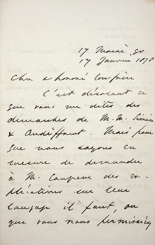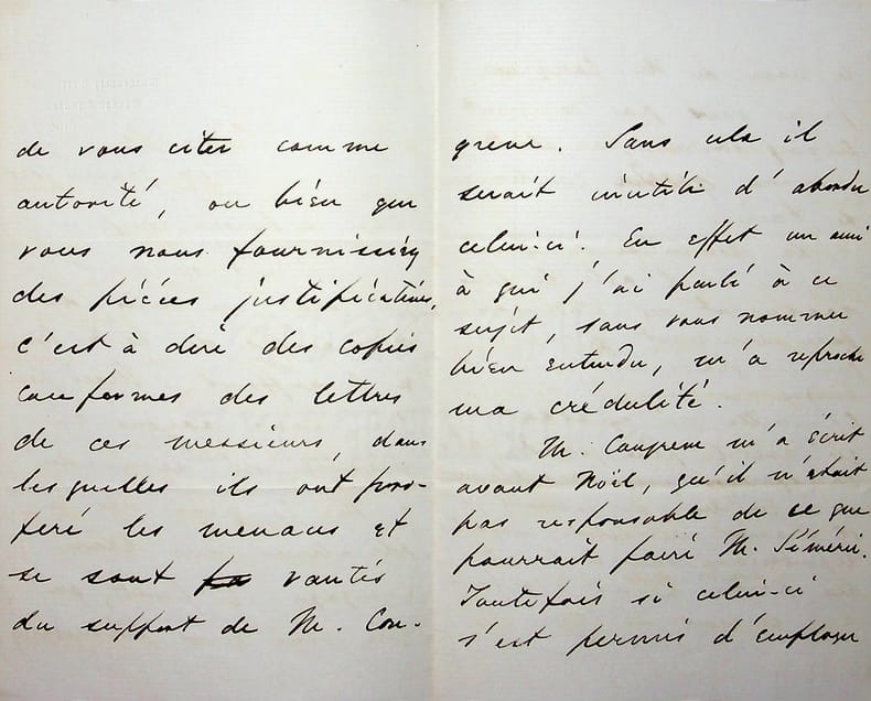 [Positivisme] Richard Congreve (1818-1899), philosophe anglais, figure de proue du positivisme en Angleterre, à l'origine du schisme en 1878 ; Mary Bury Congreve (1833-1915), épouse du philosophe ; Emily Bury Geddes (1840-1929), soeur de Mary ; James Geddes (1841-1880), époux d'Emily. L.A.S. de Mary Congreve en français & L.A.S. de Richard Congreve en françaisn contre signée par Emily et James Geddes, 15-16 Moïse 90 [15-16 janvier 1878], 6p in-8. A Mary Weyer Robinet (1827-1881), épouse du docteur Jean-François Robinet (1825-1899), médecin d'Auguste Comte et important positiviste français. « Ma chère amie, En recevant votre lettre, j'ai regretté plus que je ne saurais vous dire d'avoir tant ajourné la réponse que je vous avais, je crois, promise dans une lettre à Virginie, et qu'elle en doit pas avoir lue il me semble ou avoir interprétée dans la même manière que vous. Ayez la bonté de vérifier cela, car cela vous convaincrait que je n'ai aucunement désiré une séparation ou cessation stricte de correspondance. Pour éviter toute méprise, je la prie de me la renvoyer si elle l'a scellée jusqu'ici. Je la lui renverrais si elle veut. Je me reposais sur ce que vous me disiez dans votre bonne lettre de nouvel an où vous me dites : "Si je ne vous ai pas écrit dans ces derniers temps, c'est que je n'ai pas su avec quel désir de liberté je pouvais le faire sans blesser vos sentiments personnes" et puisque vous me parlez de souffrances, du reste je l'avais désiré, vous ne devez pas être surprise que, ne l'étant pas je crois moins, je ressentis de la peine à répondre simplement[?]. Mais je me serais épargné encore une douleur si j'y avais mis plus de promptitude. Ce que j'allais vous dire vous aurait peut-être empêchée de m'écrire sur ce sujet, ce qui eût été mieux pour toutes les deux. Car évidemment, situées comme nous sommes, les mesures étant dans d'autres mains, la meilleure chose que nous avons à faire, c'est de garder le contact[?] autant que possible et de fortifier[?] nos affections sans laisser aveugler notre jugement, voilà ce que j'entendais par mon amitié subjective pour ainsi dire - réelle autant que vous voulez, mais ne se permettant pas de visiter les choses présentes qui nous intéressent - peut-être trop. Et vous me parle de votre projet comme si le but de cette entrevue Boulevard dde la Madeleine n'était pas que M. Robinet nous exposât les raisons d'une démarche qu'il désirait tant, disait-il, pour le positivisme (il n'a presque pas été question de nos personnalités mais de nos devoirs-sacrifices a-t-il dit) et qui me répugnent tant à moi - démarche dont les inconvénients qu'il regrettait en [mot illisible] était surtout pour nous dans le cas que M. Laffitte ne se résignerait pas (ce que vous avez, vous et lui, dit qu'il ferait probablement). Que son affection pour M. Laffitte était profonde, cela se voyait, et qui a ajouté un grand poids à sa désapprobation de la directions, mais c'était comme moyen d'éviter un schisme, que M. Robinet a insisté sur notre venue et c'était en vue de ce schisme, qu'il ne contemplait que dans le cas que M. Congreve se refuserait de venir à Paris que M. Robinet, vous aussi je crois, vous avez dit que vous resteriez du côté de M. Laffitte. C'était nous, au contraire, qui nous sommes alors, comme plus tard, opposés à l'espèce de substitution sourde que vous avez désirée, et qui ne nous a pas parue désirer de mon mari. Aucune déclaration que M. Robinet se rangerait du côté de M. Laffitte si, mon mari venant, les choses [mot illisible] mal, n'a été faite. Il y a eu, je crois, confusion dans votre mémoire entre cette entrevue et la correspondance des dernières semaines de l'an passé. Dans la première, il n'y avait rien qui aurait pu nous blesser ni dans les expressions que je vous cite de la chose que vous avez écrite à M. Congreve beaucoup plus tard - elle est datée le 27 Descartes 89. "Il est pour moi hors de doute que votre présence à Paris serait le salut du Positivisme et la seule