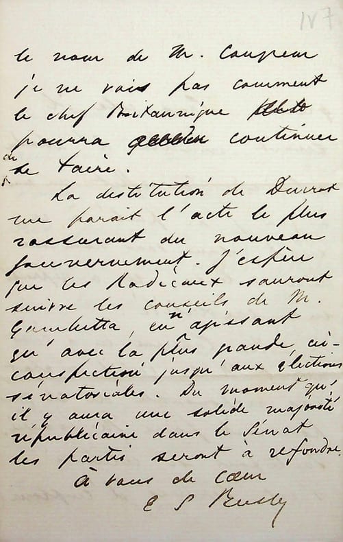 Edward Spencer Beesly (1831-1915), philosophe anglais, historien, militant syndical, positiviste. Elève de Richard Congreve, il rompt lors du schisme de 1878 et dirigera la London positivist Society. L.A.S., 17 Moïse 90 [17 janvier 1878], 4p in-8. Au docteur Jean-François Robinet (1825-1899), médecin d'Auguste Comte et important positiviste français. « Cher & honoré confrère, C'est désolant ce que vous me dites des demandes de M.M. Sémérie & Audiffrent. Mais pour que nous soyons en mesure de demander à M. Congreve des explications sur leur langage, il faut, ou que vous nous permissiez de vous citer comme autorité, ou bien que vous nous fournissiez des pièces justificatives. C'est-à-dire des copies conformes des lettres de ces messieurs, dans lesquelles ils ont proféré les menaces et se sont vantés du support de M. Congreve. Sans cela, il serait inutile d'aborder celui-ci. En effet, un ami à qui j'ai parlé à ce sujet, sans vous nommer bien entendu, m'a reproché ma crédulité. M. Congreve m'a écrit, avant Noël, qu'il n'était pas responsable de ce que pourrait faire M. Sémérie. Toutefois si celui-ci s'est permis d'employer le nom de M. Congreve, je ne vois pas comment le chef Britannique pourra continuer de se taire. La destitution de Ducrot me parait l'acte le plus rassurant du nouveau gouvernement. J'espère que les Radicaux sauront suivre les conseils de M. Gambetta, en agissant qu'avec la plus grande circonspection jusqu'aux élections sénatoriales. Du moment qu'il y aura une solide majorité républicaine dans le Sénat, les parties seront à refondre. A vous de coeur. E.S. Beesly ». Eugène Sémérie (1832-1884) était un médecin, positiviste, proche du docteur Robinet. Georges Audiffrent (1823-1909) était un médecin, positiviste, très proche d'Auguste Comte, il prendra la tête d'un schisme et sera exclus de la Société positiviste. Auguste-Alexandre Ducrot (1817-1882) est un général qui, ayant émis l'idée d'un coup d'état royaliste, sera épuré avec d'autres. Les lettres entre positivistes sont rares. [446]