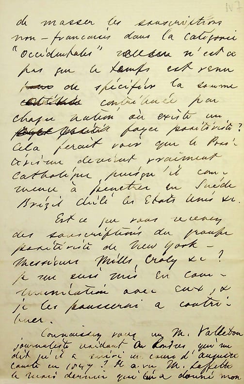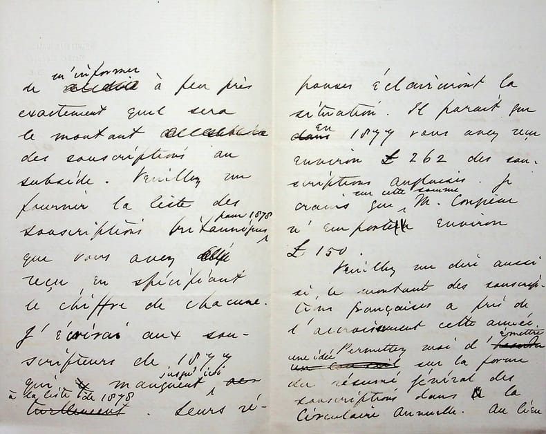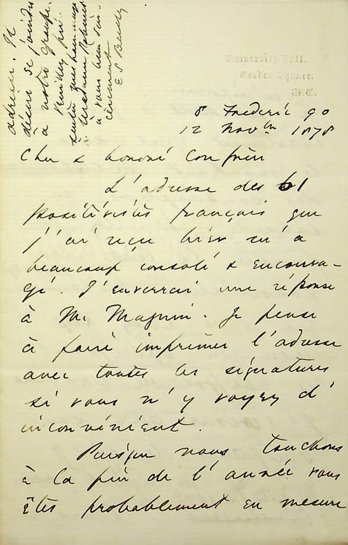 Edward Spencer Beesly (1831-1915), philosophe anglais, historien, militant syndical, positiviste. Elève de Richard Congreve, il rompt lors du schisme de 1878 et dirigera la London positivist Society. L.A.S., 8 Frédéric 90 [12 novembre 1878], 4p in-8. Au docteur Jean-François Robinet (1825-1899), médecin d'Auguste Comte et important positiviste français. « Cher & honoré Confrère, L'adresse des 61 positivistes français que j'ai reçu hier m'a beaucoup consolé & encouragé. J'enverrai une réponse à M. Magnin. Je pense à faire imprimer l'adresse avec toutes les signatures, si vous n'y voyez pas d'inconvénient. Puisque nous touchons à la fin de l'année, vous êtes probablement en mesure de m'informer à peu près exactement quel sera le montant des souscriptions au subside. Veuillez me fournir la liste des souscriptions britanniques pour 1878 que vous avez reçu en spécifiant le chiffre de chacune. J'écrirai aux souscripteur de 1877 qui manquent jusqu'ici à la liste de 1878. Leurs réponses éclairciront la situation. Il parait qu'en 1877 vous avez reçu environ £262 des souscripteurs anglais. Je crains que sur cette somme, M. Congreve m'emporte environ £150. Veuillez me dire aussi si le montant des souscriptions françaises a pris de l'accroissement cette année. Permettez-moi d'émettre une idée sur la forme du résumé général des souscriptions dans la circulaire annuelle. Au lieu de masser les souscriptions françaises dans la catégorie "occidentale", n'est-ce pas que le temps est venu de spécifier la somme contribuée par chaque nation où existe un foyer positiviste ? Cela ferait voir que le Positivisme devient vraiment catholique puisqu'il comment à pénétrer en Suède, Brésil, Chili, les Etats Unis, &c. Est-ce que vous recevez des souscriptions du foyer positiviste de New York - messieurs Mills, Croly &c ?je me suis mis en communication avec eux, & je les pousserai à contribuer. Connaissez-vous un M. Valleton, journaliste résidant à Londres qui me dit qu'il a suivi un cours d'Auguste Comte en 1847 ? Il a vu M. Laffitte le mois dernier qui lui a donné mon adresse. Il désire se joindre à notre groupe. Veuillez présenter mes hommages à madame Robinet. À vous bien sincèrement. E.S. Beesly ». Fabien Magnin (1810-1884) est un ouvrier, fondateur des cercles des prolétaires positivistes et fervent disciple d'Auguste Comte. David G Croly (1829-1889) est un journaliste irlando-américain, cofondateur de la branche américaine du Positivisme. John G Mills n'est pas identifié clairement mais il a publié un volume, Positivist prayer en 1877. Henri Valleton (1825-1886) est un révolutionnaire franc-maçon exilé à Londres. Les lettres entre positivistes sont rares. [447]