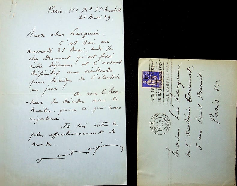 René Benjamin (1885-1948), écrivain, journaliste, prix Goncourt 1915, membre de l'Académie Goncourt. L.A.S. + enveloppe, Paris, 21 mai 1939, 1p in-8. A l'écrivain membre de l'Académie Goncourt Léo Larguier (1878-1950). « Mon cher Larguier, C'est bien au mercredi 31 mai, midi œ chez Drouant qu'est fixé et l'assaut définitif aux vieillards pour décider de l'élection de juin ! A vous l'honneur de décider avec le maître-queux ce qui nous régalera. Je suis vôtre le plus affectueusement du monde. René Benjamin ». Les vieillards sont Descaves, Ajalbert et Rosny ainé. [443]