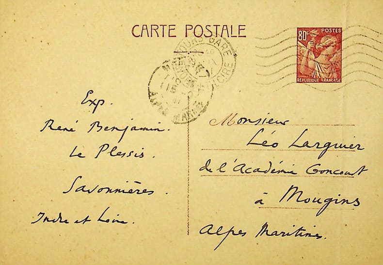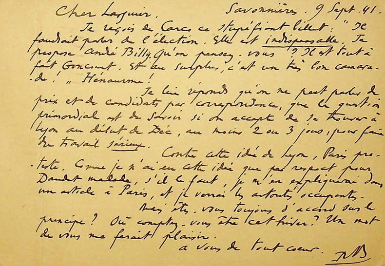 René Benjamin (1885-1948), écrivain, journaliste, prix Goncourt 1915, membre de l'Académie Goncourt. L.A.S., Savonnières, 9 septembre 1941, 1p in-12. A l'écrivain membre de l'Académie Goncourt Léo Larguier (1878-1950). « Cher Larguier, Je reçois de Carco ce stupéfiant billet : "Il faudrait parler de l'élection. Elle est indispensable. Je propose André Billy. Qu'en pensez-vous ? Il est tout-à-fait Goncourt. Et au surplus, c'est un très bon camarade !" Hénaurme ! Je lui réponds qu'on ne peut parler de prix et de candidats par correspondance, que la question primordiale est de savoir si on accepte de se trouver à Lyon au début de déc[embre], au mois 2 ou 3 jours, pour faire du travail sérieux. Contre cette idée de Lyon, Paris proteste. Comme je n'ai eu cette idée que par respect de Daudet malade, s'il le faut, je m'en expliquerai dans un article à Paris, et je verrai les autorités occupantes. Mais êtes-vous toujours d'accord sur le principe ? Où comptez-vous être cet hiver ? Un mot de vous me ferait plaisir. A vous de coeur. RB ». [443]