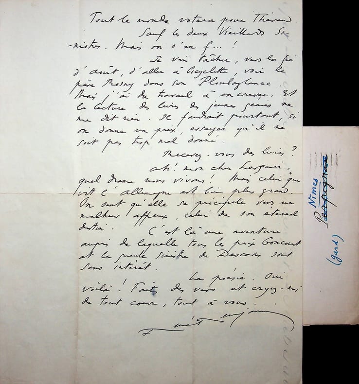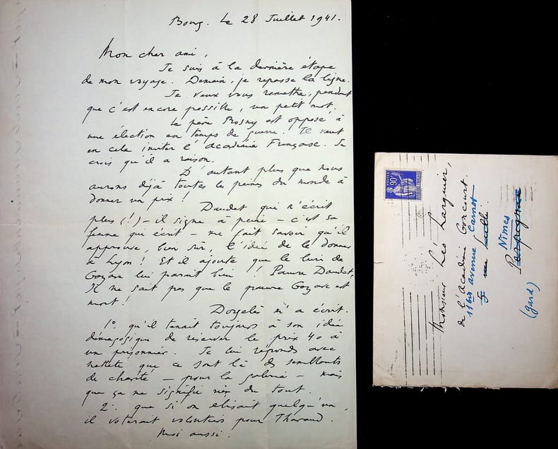 René Benjamin (1885-1948), écrivain, journaliste, prix Goncourt 1915, membre de l'Académie Goncourt. L.A.S. + enveloppe, Bourg [en Bresse ?], 28 juillet 1941, 2p in-4. A l'écrivain membre de l'Académie Goncourt Léo Larguier (1878-1950). « Mon cher ami, Je suis à la dernière étape de mon voyage. Demain, je repasse la ligne. Je veux vous remettre, pendant que c'est possible, un petit mot. Le père Rosny est opposé à une élection en temps de guerre. Il veut en cela imiter l'Académie Française. Je crois qu'il a raison. D'autant plus que nous aurons déjà toutes les peines du monde à donner un prix ! Daudet qui n'écrit plus (!) - il signe à peine - c'est sa femme qui écrit - me fait savoir qu'il approuve, bien sûr, l'idée de le donner à Lyon ! Et il ajoute que le livre de Gazave lui parait bien ! Pauvre Daudet. Il ne sait pas que le pauvre Gazave est mort ! Dorgelès m'a écrit. 1° qu'il tenait toujours à son idée démagogique de réserve le prix 40 à un prisonnier. Je lui réponds avec netteté que ce sont là des semblants de charité - pour la galerie - mais que ça ne signifie rien du tout. 2° que si on élisait quelqu'un, il voterait volontiers pour Tharaud. Moi aussi. Tout le monde votera pour Tharaud. Sauf les deux vieillards sinistres. Mais on s'en f. ! Je vais tâcher, vers la fin d'août, d'aller à bicyclette, voir le père Rosny dans son Ploubazlanec. Mais j'ai du travail à en crever. Et la lecture des livres des jeunes génies ne me dit rien. Il faudrait pourtant, si on donne un prix, essayer qu'il ne soit pas trop mal donné. Recevez-vous des livres ? Ah ! Mon cher Larguier, quel drame nous vivons ! Mais celui que vit l'Allemagne est bien plus grand. On sent qu'elle se précipite vers un malheur affreux, celui de son éternel destin. C'est là une aventure auprès de laquelle tous les prix Goncourt et la gueule sinistre de Descaves sont sans intérêt. La poésie. Oui voilà ! Faites des vers et croyez-moi, de tout coeur, tout à vous. René Benjamin ». [443]