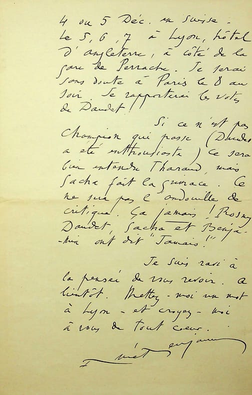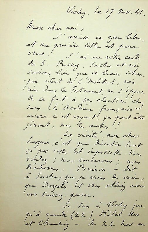René Benjamin (1885-1948), écrivain, journaliste, prix Goncourt 1915, membre de l'Académie Goncourt. L.A.S., Vichy, 17 novembre 1941, 2p in-8. A l'écrivain membre de l'Académie Goncourt Léo Larguier (1878-1950). « Mon cher ami, J'arrive en zone libre et ma première lettre est pour vous. J'ai eu votre carte du 5. Rosny, Sacha et moi savions bien que ce brave Champion était de l'Institut, mais rien dans le testament ne s'oppose de ce fait à son élection chez nous. L'Académie française encore c'est voyant, ça peut être gênant, mais les autres ! La vérité, mon cher Larguier, c'est que discuter tout ça par cartes est impossible. Vous viendrez ; nous causerons ; nous déciderons. Brisson a dit à Sacha, que je viens de voir, que Dorgelès et vous alliez avoir vos laissez-passer. Je suis à Vichy jusqu'à samedi (22) Hôtel Aix et Chambéry - du 22 nov[embre] au 4 ou 5 déc[embre] en Suisse. Le 5, 6, 7 à Lyon, hôtel d'Angleterre, à côté de la gare de Perrache. Je serai sans doute à Paris le 8 au soir. Je rapporterai les votes à Daudet. Si ce n'est pas Champion qui passe (Daudet a été enthousiaste), ce sera bien entendu Tharaud, mais Sacha fait la grimace. Ce ne sera pas l'andouille de critique. Ça jamais ! Rosny, Daudet, Sacha et Benjamin ont dit "Jamais !" Je suis ravi à la pensée de vous revoir. A bientôt. Mettez-moi un mot à Lyon - et croyez-moi à vous de tout coeur. René Benjamin ». [443]