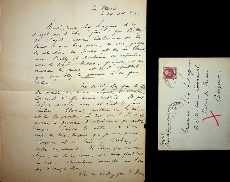 René Benjamin (1885-1948), écrivain, journaliste, prix Goncourt 1915, membre de l'Académie Goncourt. L.A.S., Le Plessis, 29 octobre 1943, 2p in-4. A l'écrivain membre de l'Académie Goncourt Léo Larguier (1878-1950). « Mais, mon cher Larguier, il ne s'agit pas d'être « gêné » par Billy ! Il s'agit, comme Carluccia (?) me le disait, il y a trois jours, de ceci qu'après les élections de Sacha et de La Varende avec Billy, l'académie va retomber dans le sixième dessous, précisément au niveau des caves et de l'Ajalbert que vous étiez le premier à ne pas tolérer ! Ne m'objectez pas l'état du monde, au milieu duquel l'Académie Goncourt n'offre aucun intérêt. On peut toujours raisonner ainsi, et c'est toujours inutile. Éternel problème de la misère et de la grandeur de nos vies ! Il n'est permis à personne d'abandonner sa petite besogne. Faisons la nôtre. Je n'ai cessé de dire, depuis que je vous connais : « Larguier est un Roi ! ». Continuez à voter royalement. N'élisez pas un critique, un de ces hommes qui nous font tant de mal. Cherchons ensemble un homme d'imagination. Vous ne viendrez pas ? Mais moi, je ne peux pas aller cette année à Avignon. J'ai tous les soucis de santé autour de moi, une vie infernale, un travail débordant. Si Billy entre, Sacha veut s'en aller. La Varende veut s'en aller. Le dernier surtout à l'air sérieux. Si le premier était entraîné par le second, je serais capable de suivre. Parce qu'au fond, je retombe de haut ! Je me suis naïvement donné beaucoup de mal depuis cinq ans pour cette académie. Je suis déçu. Je sais que c'est Dorgelès, avec sa sentimentalité, qui a fait tout le mal. Mais que vous, vous suiviez, ça me dépasse. Est-ce fatigue ? Est-ce dégoût ? Resaisissez-vous. Il y a quelque années encore, quand il se formait deux camps irréductibles dans leurs deux choix, eh bien pour pouvoir continuer à déjeuner ensemble, on ne s'entêtait pas, on se mettait d'accord sur un troisième ! Nous abandonnons Paul Fort. Abandonnez Billy. Paul Fort n'est pas, dites-vous, plus que Ponchon. Mais Billy est bien moins ! C'est le raté, l'aigri, l'homme qui n'a rien à dire et à écrire. Vous aimez la fécondité, la largeur, la grandeur. Ne les reniez pas par votre vote. Sacha n'aime pas Béraud. Il a dit : « je l'accepte ». Et Mac-Orlan, habilement pressenti reviendrait peut-être sur. une boutade. Mais non, mais mille fois non, je n'ai pas reçu Staline. Ai-je l'habitude de recevoir du Larguier sans le dire ? Ah ! cher mai, aidez-nous ! Et vous ne me donnez pas votre adresse ! A vous de tout coeur. René Benjamin ». [443]