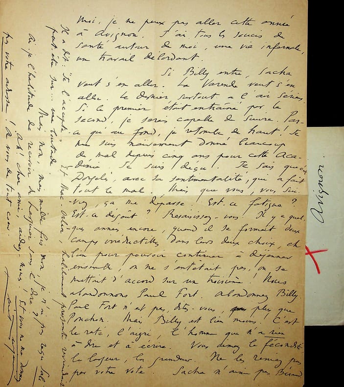 Roland Dorgelès (1885-1973), écrivain, membre de l'Académie Goncourt. L.A.S., sd [été 1944, probablement avant août, 2p in-4. A l'écrivain membre de l'Académie Goncourt Léo Larguier (1878-1950). « Cher Larguier, Si j'apprends un jour que vous avez été frappé de la crainte des écrivains, je me consolerai en pensant que le rival ne vous est pas venu en m'écrivant. Paresseux devant l'encrier, craintif devant le chemin de fer : que vous reste-t-il. Dufy, toujours notre hôte, a pris du poids et des couleurs : avis aux blafards et aux efflanqués. Maintenant, parlons Goncourt. J'ai reçu : 1° une lettre du père Rosny m'exposant ses tourments au sujet de l'élection prochaine. "Sacha se montre intransigeant" me dit-il. Et il ne répond pas à mes lettres. Larguier non plus.." 2° une lettre de Billy à qui Descaves et Ajalbert ont conseillé d'intervenir auprès de nous deux pour que l'élection ait lieu en octobre ou début novembre, de façon que l'élu ait le temps de se préparer au vote pour le prix de décembre. J'ai répondu à Rosny - que jamais élection ne s'était annoncée si facile. Billy - devant passer dès le premier tout avec 5 voix - Et lui demande la sienne, ce qui ferait six. A Billy je réponds qu'effectivement on a toujours complété l'Académie avant décembre ; ce fut notamment mon cas. Et je lui dis que je vous écris dans ce sens. En qualité de vice-président, vous pourriez écrire à Rosny, avec l'assentiment des quatre mousquetaires dont un auvergnat, pour lui demander que l'élection ait lieu, conformément à la tradition, bien avant l'attribution du prix. Si nous sommes d'accord, tout ira bien. Les deux mains Roland Dorgelès ». [445]
