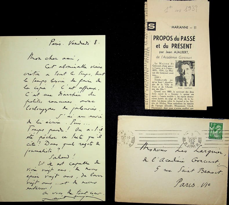 René Benjamin (1885-1948), écrivain, journaliste, prix Goncourt 1915, membre de l'Académie Goncourt. L.A.S., Paris, 8 décembre 1939, A l'écrivain membre de l'Académie Goncourt Léo Larguier (1878-1950) contre l'écrivain Jean Ajalbert : « Mon cher ami, Cet abominable vieux crétin a tout le temps, tout le temps besoin de faire de la copie ! C'est affreux. C'est une diarrhée de petites rancunes avec borborygmes de jalousies. J'ai eu envie de lui écrire. Puis. Temps perdu ! Où a-t-il été pêcher ce texte qu'il cite ? Dans quels ragots de journaliste ? Salaud ! Et il est capable de vivre vingt ans, de nous épier vingt ans, de baver vingt ans. et de nous enterrer ! A vous de tout coeur René Benjamin ». Le crétin est Jean Ajalbert. On joint l'article contre lequel Benjamin écrit. [443]