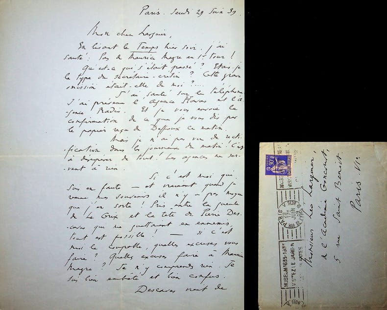 René Benjamin (1885-1948), écrivain, journaliste, prix Goncourt 1915, membre de l'Académie Goncourt. L.A.S. + enveloppe, Paris, 29 juin 1939, 2p in-4. A l'écrivain membre de l'Académie Goncourt Léo Larguier (1878-1950). « Mon cher Larguier, En lisant Le Temps hier soir, j'ai sauté : pas de Maurice Magre au 1er tour ! Qu'est-ce qui s'est passé ? Etais-je le type de secrétaire-crétin ? C'est grave incision était-elle de moi ?. J'ai sauté sur le téléphone. J'ai prévenu l'agence Havas et l'agence Radio. Et je vous envoie la confirmation de ce que je vous dis par le papier reçu de Deffoux ce matin. Mais je n'ai pas vu de rectification dans les journaux du matin ! C'est à désespérer de tout ! Les agences ne servent à rien. Si c'est moi qui suis en faute - et vraiment quand je remue mes souvenirs il n'y a pas moyen que j'en sorte ! Pris entre la gueule de Le Grix et la tête de Pierre Descaves qui me guettaient en ennemis, tout est possible ! - si c'est moi le coupable, quelles excuses vous faire ? Quelles excuses faire à Maurice Magre ? Je n'y comprends rien. Je suis bien embêté et bien confus. Descaves vient de m'écrire ceci : "Benjamin, J'espère, n'ayant plus rien à me demander, que vous n'avez plus rien à me dire. Restons-en là, voulez-vous ? Nous nous reverrons encore. mais de loin. L.D." Ce mot est particulièrement dégoûtant. Car jamais, au grand jamais, je n'ai rien demandé à Descaves. C'est un malheureux qui n'est maître ni de ses nerfs ni de sa pensée. Cher Larguier, je pars dans quelques jours. Si je ne vous revois pas, bon été ! Ne m'en veuillez pas trop pour cette histoire de scrutin, où. si j'ai cafouillé, j'ai fait tout pour réparer, et croyez-moi de tout coeur à vous. René Benjamin ». [443]