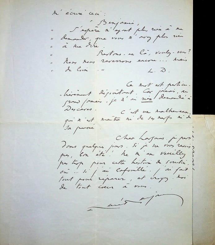 René Benjamin (1885-1948), écrivain, journaliste, prix Goncourt 1915, membre de l'Académie Goncourt. L.A.S. + enveloppe, 5 mai 1939, 1p 1/2 in-4. A l'écrivain membre de l'Académie Goncourt Léo Larguier (1878-1950). « Cher ami, J'ai vu Daudet hier soir. Il a bien ri, de bien bon coeur. Il m'a dit : -ne vous occupez pas de cela ! Laissez-le faire. S'il veut donner sa démission, qu'il la donne ! C'est un enfant. Il faut le remettre en nourrice. Ce qui est drôle, c'est qu'il croit que cela nous ferait quelque chose et que cela aurait de l'importance ! Tou le monde s'en fouterait, nous autres, le public, et le quartier de la Santé ! C'est idiot de dire que Sacha n'a pas de talent : il en a trop. Et au lieu de nous soucier de Descaves, de sa bile et de sa rogne, - à votre place, je ne retournerais même pas le voir, - il faut s'occuper d'élire Sacha le plus vite possible ! Est-ce l'avis de Larguier ? Un temps. Il se remet à lire, et il ajoute : -sa démission ! Mais il n'y a qu'à lui dire qu'il ne peut pas la donner ! Que les statuts le lui défendent ! Quel raseur ! Voilà. Je vous ai rapporté fidèlement l'entrevue. Il me reste à vous serrer les deux mains. René Benjamin ». [suit une note autographe de Léo Larguier] « René Benjamin était venu me dire qu'il avait vu L. Descaves, qu'à l'idée de l'élection de Sacha Guitry, il était devenu fou, affirmant qu'il démissionnerait le lendemain de l'élection. J'avais conseillé à Benjamin de voir Daudet ; il m'écrit ceci après l'avoir vu ». [443]