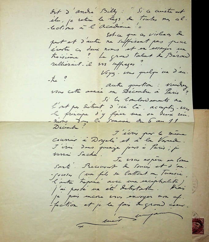 Roland Dorgelès (1885-1973), écrivain, membre de l'Académie Goncourt. L.A.S., sd [été 1944, probablement avant août, 2p in-4. A l'écrivain membre de l'Académie Goncourt Léo Larguier (1878-1950). « Cher Larguier, Si j'apprends un jour que vous avez été frappé de la crainte des écrivains, je me consolerai en pensant que le rival ne vous est pas venu en m'écrivant. Paresseux devant l'encrier, craintif devant le chemin de fer : que vous reste-t-il. Dufy, toujours notre hôte, a pris du poids et des couleurs : avis aux blafards et aux efflanqués. Maintenant, parlons Goncourt. J'ai reçu : 1° une lettre du père Rosny m'exposant ses tourments au sujet de l'élection prochaine. "Sacha se montre intransigeant" me dit-il. Et il ne répond pas à mes lettres. Larguier non plus.." 2° une lettre de Billy à qui Descaves et Ajalbert ont conseillé d'intervenir auprès de nous deux pour que l'élection ait lieu en octobre ou début novembre, de façon que l'élu ait le temps de se préparer au vote pour le prix de décembre. J'ai répondu à Rosny - que jamais élection ne s'était annoncée si facile. Billy - devant passer dès le premier tout avec 5 voix - Et lui demande la sienne, ce qui ferait six. A Billy je réponds qu'effectivement on a toujours complété l'Académie avant décembre ; ce fut notamment mon cas. Et je lui dis que je vous écris dans ce sens. En qualité de vice-président, vous pourriez écrire à Rosny, avec l'assentiment des quatre mousquetaires dont un auvergnat, pour lui demander que l'élection ait lieu, conformément à la tradition, bien avant l'attribution du prix. Si nous sommes d'accord, tout ira bien. Les deux mains Roland Dorgelès ». [445]