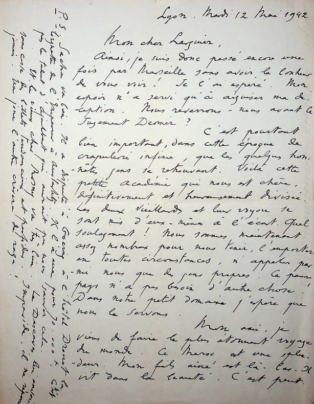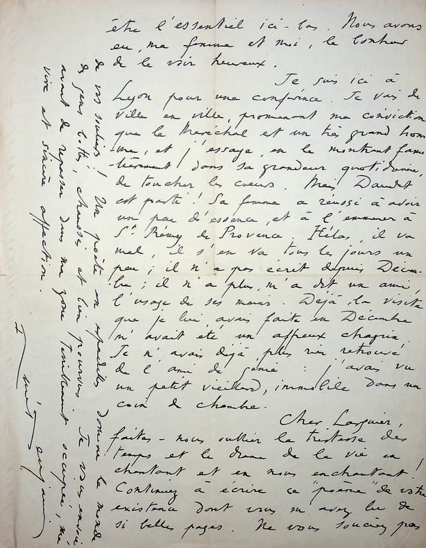 René Benjamin (1885-1948), écrivain, journaliste, prix Goncourt 1915, membre de l'Académie Goncourt. L.A.S., Lyon, 12 mai 1942, 2p in-4. A l'écrivain membre de l'Académie Goncourt Léo Larguier (1878-1950). « Mon cher Larguier, Ainsi, je suis donc passé encore une fois pour Marseille sans avoir le bonheur de vous voir ! Je l'ai espéré. Mon espoir n'a servi qu'à aiguiser ma déceptions. Nous reverrons-nous avant le Jugement Dernier ? C'est pourtant bien important, dans cette époque de crapulerie infinie, que les quelques honnêtes gens se retrouvent. Voilà cette petite Académie qui nous est chère, définitivement et heureusement divisée. Les deux vieillards et leur voyou se sont mis d'eux-mêmes à l'écart. Quel soulagement ! Nous sommes maintenant assez nombreux pour nous tenir, l'emporter en toutes circonstances, n'appeler parmi nous que des gens propres. Ce pauvre pays n'a pas besoin d'autre chose. Dans notre petit domaine, j'espère que nous le servons. Mon ami, je viens de faire le plus étonnant voyage du monde. Ce Maroc est une splendeur. Mon fils ainé est là-bas. Il vit dans la beauté. C'est peut-être l'essentiel ici-bas. Nous avons eu, ma femme et moi, le bonheur de le voir heureux. Je suis ici à Lyon pour une conférence. Je vais de ville en ville, promenant ma conviction que le maréchal est un très grand homme, et j'essaye, en le montrant familièrement dans sa grandeur quotidienne, de toucher les coeurs. Mais Daudet est parti ! Sa femme a réussi à avoir un peu d'essence, et à l'emmener à St Rémy de Provence. Hélas, il va mal, il s'en va tous les jours un peu ; il n'a plus, m'a dit un ami, l'usage de ses mains. Déjà, la visite que je lui avais faite en décembre m'avait été un affreux chagrin. Je n'avais déjà plus rien retrouvé de l'ami de génie : j'avais vu un petit vieillard, immobile dans un coin de chambre. Cher Larguier, faites-nous oublier la tristesse des temps et le drame de la vie en chantant et en nous enchantant ! Continuez à écrire ce "poème" de votre existence dont vous m'avez lu de si belles pages. Ne vous souciez pas de vos souliers ! Un poète en espadrilles domine le monde des gens bottés, chaussés et bien pourvus. Je vous envoie avant de repasser dans ma zone terriblement occupée, ma vive et sincère affection. René Benjamin. P.S. Sacha va bien. Il a disputé à Goering à l'hôtel Drouot la lorgnette de l'Empereur à Austerlitz. Il l'a eue pour 70.000f. Ce n'est pas le talent d'Ajalbert qui aurait pu nous sauver cela. Et le vieux cher Rosny va très bien. Le Descaves lui envoie sans cesse des billets tendancieux et perfides. Impavide, il ne répond jamais. Un jour l'autre crèvera de rage ! ». [444]