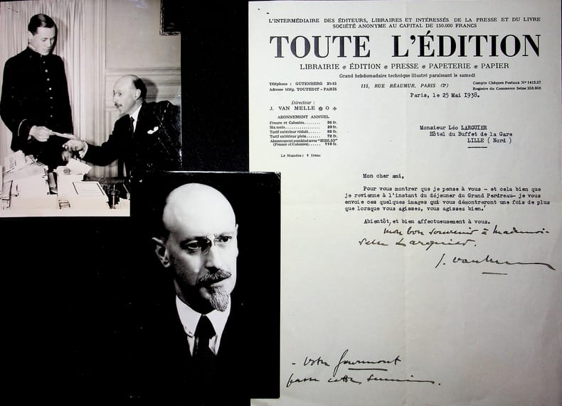 René Benjamin (1885-1948), écrivain, journaliste, prix Goncourt 1915, membre de l'Académie Goncourt. Photographies + L.S. de Joseph Van Melle. A l'écrivain membre de l'Académie Goncourt Léo Larguier (1878-1950). 1 : « Merci, mon cher Larguier, R. Benjamin 25.5.38 » (de la main de Van Melle) au dos d'un portrait. 2 : une photo quand René Benjamin apprend son élection à l'Académie Goncourt. 3 : L.S de Van Melle. René Benjamin est élu le 25 mai 1938, jour de ces documents. [444]