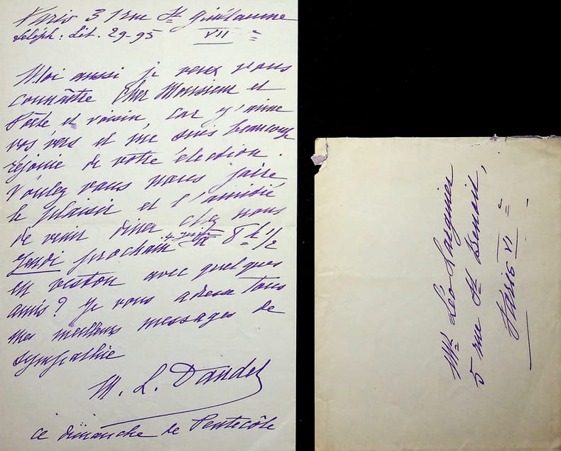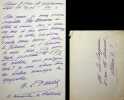 Marthe Allard Daudet (1878-1960), journaliste, épouse de Léon Daudet. L.A.S. + enveloppe, dimanche de Pentecôte [31mai 1936], 1p in-8. A l'écrivain membre de l'Académie Goncourt Léo Larguier (1878-1950). « Moi aussi je veux vous connaître, cher Monsieur et Poète, et voisin, car j'aime vos vers et me suis beaucoup réjouie de votre élection. Voulez-vous nous faire le plaisir et l'amitié de venir diner chez nous jeudi prochain 4 juin à 8h œ en veston avec quelques amis ? Je vous adresse tous mes meilleurs messages de sympathie. M.L.Daudet ». [444]