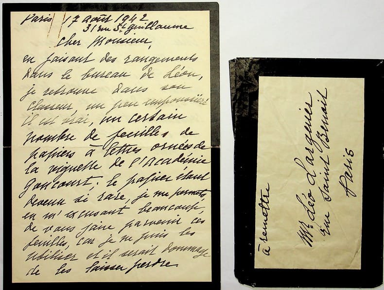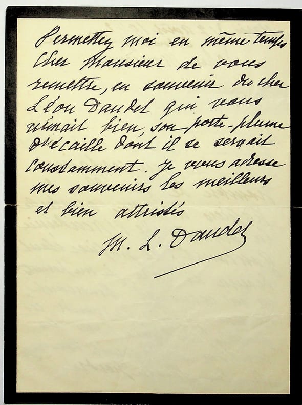Marthe Allard Daudet (1878-1960), journaliste, épouse de Léon Daudet. L.A.S. + enveloppe, Paris, 17 août 1942, 2p in-8. A l'écrivain membre de l'Académie Goncourt Léo Larguier (1878-1950). « Cher monsieur, En faisant des rangements dans le bureau de Léon, je retrouve dans son classeur, un peu empoussiéré il est vrai, un certain nombre de feuilles de papiers à lettres ornées de la vignette de l'Académie Goncourt ; le papier état devenu si rare, je me permets, en m'excusant beaucoup, de vous faire parvenir ces feuilles, car je ne puis les utiliser et il serait dommage de les laisser perdre. Permettez-moi en même temps, cher monsieur, de vous remettre, en souvenir du cher Léon Daudet qui vous aimait bien, son porte-plume d'écaille dont il se servait constamment. Je vous adresse mes souvenirs les meilleurs et bien attristés. M.L.Daudet ». [444]
