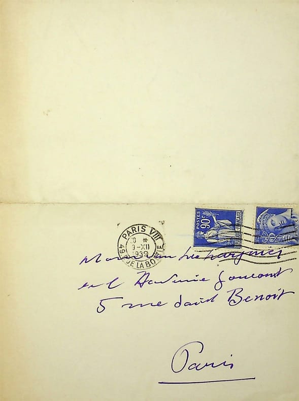 René Benjamin (1885-1948), écrivain, journaliste, prix Goncourt 1915, membre de l'Académie Goncourt. L.A.S. + Enveloppe, Paris, 30 mai 1939, 2p in-8 A l'écrivain membre de l'Académie Goncourt Léo Larguier (1878-1950). « Mon cher ami, Voulez-vous être assez bon, avant que nous déjeunions demain ensemble, pour prendre connaissance du document ci-joint. C'est une lettre que Sacha Guitry a reçue du sieur Ajalbert. Elle lui a semblé d'une grande bassesse (vous savez qu'il n'a pas vu Ajalbert depuis vingt ans). Il m'a téléphoné tout de suite son dégoût, me disant qu'il ne répondrait pas, mais qu'il m'enverrait une copie, afin que je la montre à mes collègues. Je l'ai montrée hier à Daudet, après être passé rue St Benoit, où vous n'étiez pas. Daudet m'a dit : « il faut rire ! » mais il était attristé. J'ai téléphoné ce matin la lettre à Dorgelès, en supprimant bien entendu l'horrible allusion à sa femme et à Jean G. - mais il pouvait entendre tout le reste. Et la voici pour vous. Vous, mon cher ami, qui aimez la grandeur et avec des instincts princiers, je crois que souffrirez. A demain. Vous serez gentil de me rendre le document après le déjeuner : nous partirons ensemble. A vous de tout coeur. René Benjamin ». On joint la copie de la lettre d'Ajalbert, de la main de Léo Larguier (2p in-8). Jean G est Jean Guitry (1884-1920), acteur, frère ainé de Sacha. [443]