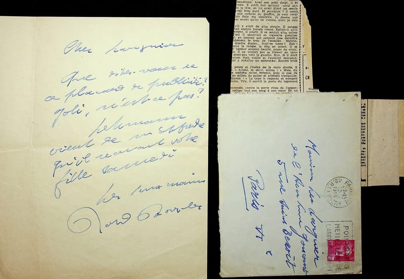Roland Dorgelès (1885-1973), écrivain, membre de l'Académie Goncourt. L.A.S. + enveloppe, Paris, 12 décembre 1948, 1p in-8. A l'écrivain membre de l'Académie Goncourt Léo Larguier (1878-1950). « Cher Larguier, Que dites-vous de ce placard de publicité ? Joli, n'est-ce pas ? Le. vient de m'apprendre qu'il recevait votre fille samedi. Les deux mains. Roland Dorgelès ». On joint la coupure de journal annonçant la publication du roman de Serge Groussard, Crépuscule des vivants, mentionnant ses scores aux prix Goncourt et Femina (où il est arrivé 2e à chaque fois). [444]
