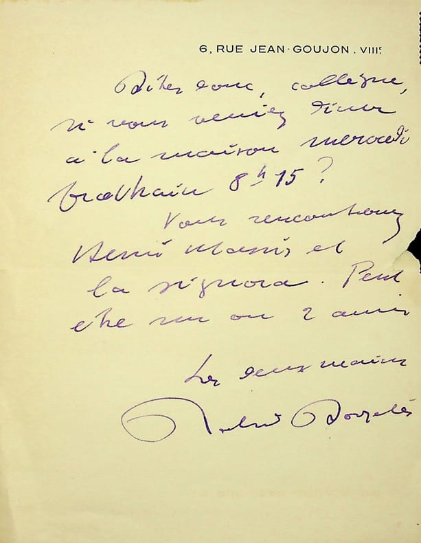 Roland Dorgelès (1885-1973), écrivain, membre de l'Académie Goncourt. L.A.S., Paris, 18 juin 1937, 1p in-8. A l'écrivain membre de l'Académie Goncourt Léo Larguier (1878-1950). « Dites donc, collègue, si vous veniez diner à la maison mercredi prochain 8h15 ? Vous rencontreriez Henri Massis et la signora. Peut-être un ou 2 amis. Les deux mains. Roland Dorgelès ». [444]