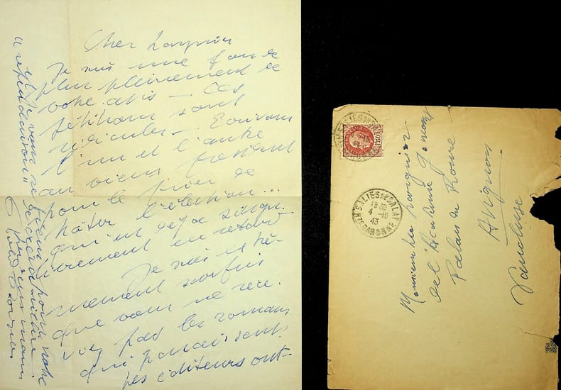 Roland Dorgelès (1885-1973), écrivain, membre de l'Académie Goncourt. L.A.S. + enveloppe, Probablement 4 octobre 1943, 2p in-8. A l'écrivain membre de l'Académie Goncourt Léo Larguier (1878-1950). « Cher Larguier, Je suis une fois de plus pleinement de votre avis - ces pétitions sont ridicules - écrivons l'un et l'autre au vieux président pour le prier de hâter l'élection. qui est déjà [mot illisible] librement en retard. Je suis extrêmement surpris que vous ne receviez pas les romans qui paraissent. Les éditeurs ont-ils bien votre adresse d'Avignon ? Peut-être certains ont-ils perdu votre porte ? Je n'ai encore rien reçu qui m'enflamme et pourtant j'en ai lu près de cinquante. Toutefois, je termine à l'instant un excellent petit roman jeune fille rousse dans une île, paru aux éditions Sequana. C'est d'une qualité bien supérieure à tout le reste. Je n'ai pas reçu votre "Sabine". Arrachez-vous à votre mélancolie. Nous reprendrons à Paris les causeries ambulantes d'autrefois et je vous retiens pour votre "rependaison" de crémaillère. Les deux mains. Roland Dorgelès ». [445]