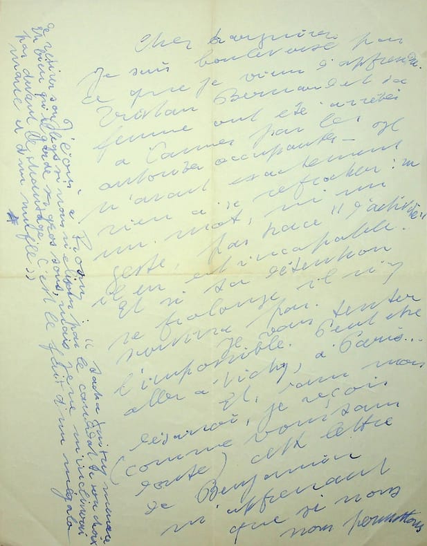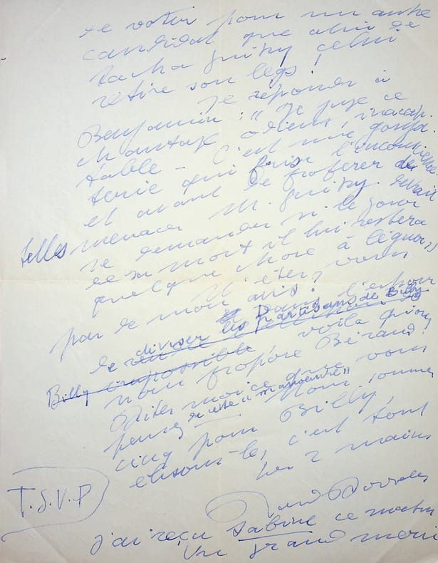 Roland Dorgelès (1885-1973), écrivain, membre de l'Académie Goncourt. L.A.S., sd [après le 4 octobre 1943], 2p in-4. A l'écrivain membre de l'Académie Goncourt Léo Larguier (1878-1950). « Cher Larguier, Je suis boulversé par ce que je viens d'apprendre. Tristan Bernard et sa femme ont été arrêtés à Cannes par les autorités occupantes. Il n'avait exactement rien à se reprocher : ni un mot, ni un geste, pas trace "d'activité", il en est incapable. Et si sa détention se prolonge, il n'en survivra pas. Je vais tenter l'impossible. Peut-être aller à Vichy, à Paris. Et, dans mon désarroi, je reçois (comme vous sans doute) cette lettre de Benjamin m'apprenant que si nous nous permettons de voter pour un autre candidat que celui de Sacha Guitry, celui[-ci] retire son legs ! Je réponds à Benjamin : "Je juge ce chantage odieux, inacceptable. C'est une goujaterie qui frise l'inconscience et avant de proférer de telles menaces, M. Guitry devrait se demander si le jour de sa mort, il lui restera quelque chose à léguer". N'êtes-vous pas de mon avis ? Dans l'espoir de diviser les partisans de Billy, voilà qu'on nous propose Béraud ! Dites-moi ce que vous pensez de cette « manoeuvre ». Nous sommes cinq pour Billy, élisons-le, c'est tout. Les 2 mains. Roland Dorgelès. J'ai reçu Sabine ce matin. Un grand merci. J'écris à Rosny : « Sacha Guitry menace de retirer son legs si nous n'élisons pas le candidat de son choix. Eh bien qu'il garde ses gros sous, mais je ne m'inclinerai pas devant le chantage. C'est le fait d'un mégalomane et d'un mufle ». ». Tristant Bernard fut arrêté le 30 septembre alors qu'il projetait de se réfugier chez Dorgelès. Libéré le 21 octobre grâce à Sacha Guitry. [445]