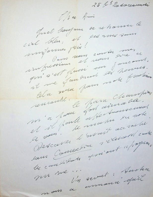Roland Dorgelès (1885-1973), écrivain, membre de l'Académie Goncourt. L.A.S., sd [après le 27 décembre 1941], 2p in-4. A l'écrivain membre de l'Académie Goncourt Léo Larguier (1878-1950). « Cher Ami, Quel bonjour de retrouver le ciel bleu, et les rues sans uniformes gris ! Pour vous conter mes impressions et vous dire ce qui s'est passé au Goncourt, il me faudrait des revues. Cela sera pour notre prochaine rencontre. Ce Pierre Champion m'a paru fort aimable, et il parle affectueusement de vous. Le matin du vote, Descaves l'avait accroché dans Comoedia s'élevant contre les candidats qui ont « pognon » sur rue. Un secret : Sacha nous a annoncé qu'il léguait son hôtel, ses tableaux et ses livres à l'Académie Goncourt. Nous perdîmes un grenier, nous aurons un salon. - Ne fixez pas la date trop tôt, nous a-t-il dit en souriant. Benjamin n'est pas bien portant. Rosny est merveilleux. On avait de Daudet les plus mauvaises nouvelles. Quant à Guitry, qui grisonnait, ses cheveux sont blond. Je n'ose croire à un miracle. Comme je vous l'avais promis, j'ai écrit à votre fille, mais par ces jours de fête, la poste ne va pas vite et je suis parti sans avoir reçu de réponse. Tous ont déploré votre absence même les journalistes qui me harcelaient à la sortie de chez Drouant. Les deux mains. Roland Dorgelès ». [445]