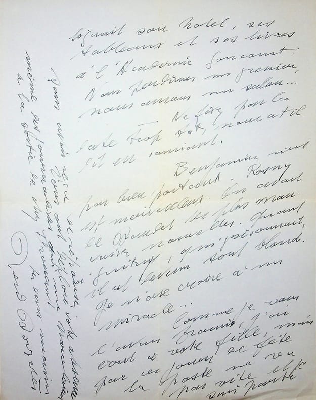 René Benjamin (1885-1948), écrivain, journaliste, prix Goncourt 1915, membre de l'Académie Goncourt. L.A.S. + enveloppe, 5 mai 1939, 1p 1/2 in-4. A l'écrivain membre de l'Académie Goncourt Léo Larguier (1878-1950). « Cher ami, J'ai vu Daudet hier soir. Il a bien ri, de bien bon coeur. Il m'a dit : -ne vous occupez pas de cela ! Laissez-le faire. S'il veut donner sa démission, qu'il la donne ! C'est un enfant. Il faut le remettre en nourrice. Ce qui est drôle, c'est qu'il croit que cela nous ferait quelque chose et que cela aurait de l'importance ! Tou le monde s'en fouterait, nous autres, le public, et le quartier de la Santé ! C'est idiot de dire que Sacha n'a pas de talent : il en a trop. Et au lieu de nous soucier de Descaves, de sa bile et de sa rogne, - à votre place, je ne retournerais même pas le voir, - il faut s'occuper d'élire Sacha le plus vite possible ! Est-ce l'avis de Larguier ? Un temps. Il se remet à lire, et il ajoute : -sa démission ! Mais il n'y a qu'à lui dire qu'il ne peut pas la donner ! Que les statuts le lui défendent ! Quel raseur ! Voilà. Je vous ai rapporté fidèlement l'entrevue. Il me reste à vous serrer les deux mains. René Benjamin ». [suit une note autographe de Léo Larguier] « René Benjamin était venu me dire qu'il avait vu L. Descaves, qu'à l'idée de l'élection de Sacha Guitry, il était devenu fou, affirmant qu'il démissionnerait le lendemain de l'élection. J'avais conseillé à Benjamin de voir Daudet ; il m'écrit ceci après l'avoir vu ». [443]