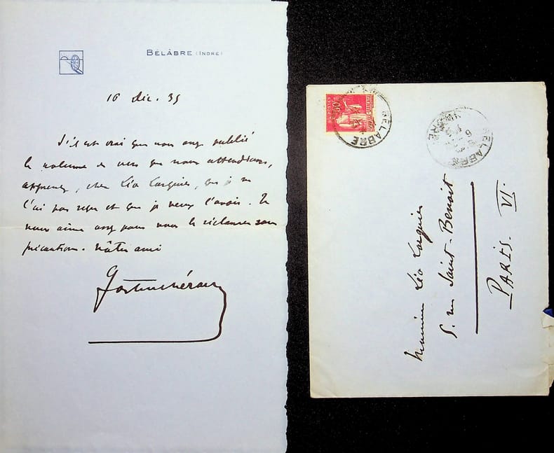 Gaston Chérau (1872-1937), écrivain, membre de l'Académie Goncourt. L.A.S. + enveloppe, Belâbre, 16 décembre 1935, 1p in-8. A l'écrivain membre de l'Académie Goncourt Léo Larguier (1878-1950). « S'il est vrai que vous avez publié le volume de vers que nous attendions, apprenez, cher Léo Larguier, que je ne l'ai pas reçu et que je veux l'avoir. Je vous aime assez pour le réclamer sans précaution. Votre ami Gaston Chérau ». [446]