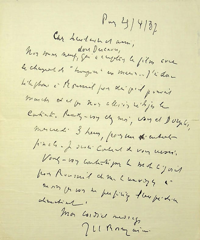 J.H. Rosny aîné (1856-1940), écrivain, fondateur de la science-fiction moderne, membre de l'Académie Goncourt. L.A.S., Paris, 25 avril 1937, 1p in-12. A l'écrivain membre de l'Académie Goncourt Léo Larguier (1878-1950). « Cher secrétaire et ami, Nous sommes neuf, dont Descaves, qui acceptons le film avec le changement de « troupier » en marin. j'ai donc téléphoné à Rousseil pour dire qu'il pouvait marcher et que nous allions rédiger le contrat. Rendez-vous chez moi, vous et Dorgelès, mercredi 3 heures, pour une entente finale. Je serai content et vous aussi. Voulez-vous contresigner le mot ci-joint pour Rousseil et me le renvoyer à moins que vous ne préfériez l'expédier directement. Mon cordial hommage JH Rosny ainé ». [446]