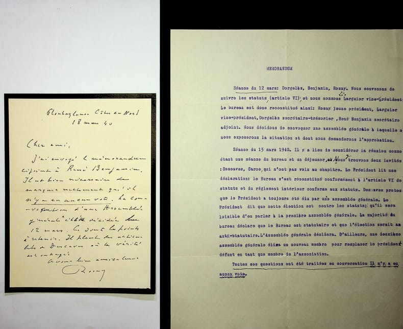 Séraphin Justin François Boex dit J.-H. Rosny jeune (1859-1948), écrivain, membre de l'Académie Goncourt. L.A.S. + tapuscrit, Ploubazlanec, 18 mars 1940, 1p in-8 & 1p in-4. A l'écrivain membre de l'Académie Goncourt Léo Larguier (1878-1950). « Cher ami, J'ai envoyé le mémorandum ci-joint à René Benjamin. Il est bien nécessaire de marquer nettement qu'il n'y a eu aucun vote. La convocation d'une assemblée général a été décidée le 12 mars. Ce sont les points à retenir. Il pleut des articulets de Descaves où ma vérité est outragée. A vous bien amicalement Rosny ». On joint le Memorandum rendant compte d'une séance du 12 mars 1940 avec Dorgelès, Benjamin et Rosny pour prendre en main l'Académie : Rosny président, Larguier vice-p, Dorgelès secrétaire-trésorier et Benjamin secrétaire adjoint. Puis séance du 13 mars 1940 avec Descaves et Carco. Descaves proteste, une confirmation sera attendue lors d'une assemblée générale. Une autre AG pour remplacer Rosny ainé prévue (elle n'aura lieu qu'en décembre 1941). [446]