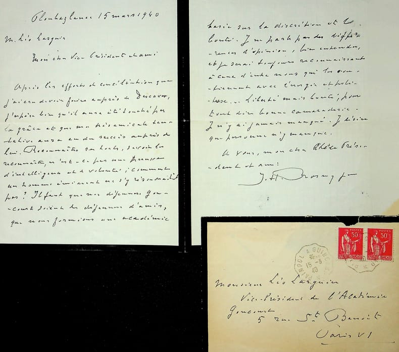 Séraphin Justin François Boex dit J.-H. Rosny jeune (1859-1948), écrivain, membre de l'Académie Goncourt. L.A.S. + enveloppe, Ploubazlanec, 15 mars 1940, 2p in-8. A l'écrivain membre de l'Académie Goncourt Léo Larguier (1878-1950). « Mon cher Vice-Président et ami, Après les efforts de conciliation que j'ai cru devoir faire auprès de Descaves, j'espère bien qu'il aura été touché par la grâce et que ma très amicale tentative aura eu du succès auprès de lui. Reconnaître ses torts, savoir les reconnaître, n'est-ce pas une preuve d'intelligence et de volonté ; comment un homme éminent ne s'y résoudrait pas ? Il faut que nos déjeuners Goncourt soient les déjeuners d'amis, que nous formions une académie basée sur la discrétion et la bonté. Je ne parle pas des différences d'opinion, bien entendu, et je serai toujours reconnaissant à ceux d'entre nous qui les soutiennent avec énergie et politesse. Liberté mais bonté ; pour tout dire bonne camaraderie. Je n'y ai jamais manqué. Je désire que personne n'y en manque. A vous, mon cher Vice-Président et ami J.H. Rosny jeune ». [446]