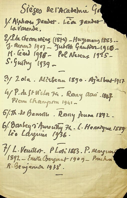 Léo Larguier (1878-1950), écrivain, membre de l'Académie Goncourt. P.A., sd [1942], 2p in-8. Liste des membres de l'Académie Goncourt depuis 1874, contenant donc les membres qui ne seront plus là lors de la création en 1900. [446]