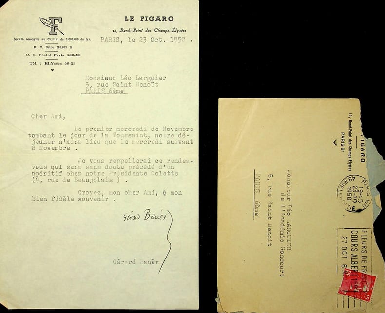Gérard Bauër (1888-1967), écrivain, membre de l'Académie Goncourt, président de la Société des Gens de Lettres. L.S., 23 octobre 1950, 1p in-8. A l'écrivain membre de l'Académie Goncourt Léo Larguier (1878-1950). Prochaine réunion de l'Académie. Larguier ne pourra y aller, il meurt le 31 octobre. [446]