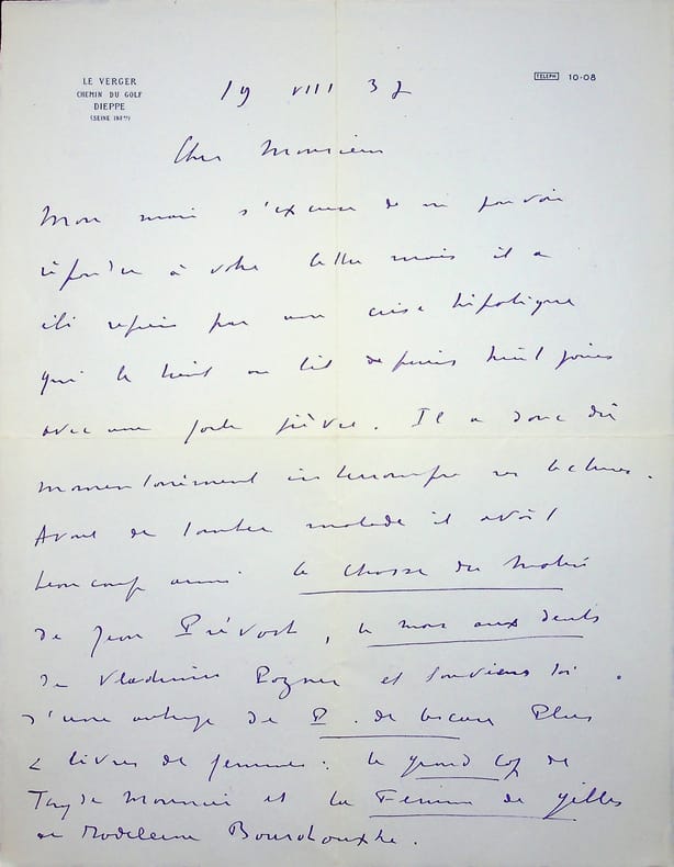 Antoinette Neveux (1883-1977), épouse du poète Pol Neveux (1865-1939). L.A.S., Dieppe, 19 août 1937, 2p in-4. A l'écrivain membre de l'Académie Goncourt Léo Larguier (1878-1950). « Cher Monsieur, Mon mari s'excuse de ne pouvoir répondre à votre lettre mais il a été repris par une crise hépatique qui le tient au lit depuis huit jours avec une forte fièvre. Il a donc dû momentanément interrompre ses lectures. Avant de tomber malade, il avait beaucoup aimé La Chasse du matin de Jean Prévost, Le mors aux dents de Vladimir Pozner et Souviens-toi d'une auberge de P de Lescure. Plus 2 livres de femmes : le Grand Cap de Thyde Monnier et La Femme de Gilles de Madeleine Bourdouxhe. Pour ce qui est de donner le prix à un étranger écrivant en français, Pol ne se souvient plus si dans les dispositions de Mr de Goncourt le cas est envisagé. s'il ne l'est pas - et vous, juriste, vous êtes meilleur juge que quiconque, Pol serait très disposé à récompenser cette sorte de candidat : il croit que le cas Plisnier a fait du tort en Belgique, [mots illisibles]. Trouvez ici cher Monsieur pour vous et pour votre femme mes souvenirs les meilleurs. Ant[oinette] Pol Neveux ». [446]