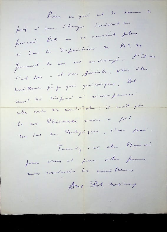 Roland Dorgelès (1885-1973), écrivain, membre de l'Académie Goncourt. L.A.S., sd [été 1944, probablement avant août, 2p in-4. A l'écrivain membre de l'Académie Goncourt Léo Larguier (1878-1950). « Cher Larguier, Si j'apprends un jour que vous avez été frappé de la crainte des écrivains, je me consolerai en pensant que le rival ne vous est pas venu en m'écrivant. Paresseux devant l'encrier, craintif devant le chemin de fer : que vous reste-t-il. Dufy, toujours notre hôte, a pris du poids et des couleurs : avis aux blafards et aux efflanqués. Maintenant, parlons Goncourt. J'ai reçu : 1° une lettre du père Rosny m'exposant ses tourments au sujet de l'élection prochaine. "Sacha se montre intransigeant" me dit-il. Et il ne répond pas à mes lettres. Larguier non plus.." 2° une lettre de Billy à qui Descaves et Ajalbert ont conseillé d'intervenir auprès de nous deux pour que l'élection ait lieu en octobre ou début novembre, de façon que l'élu ait le temps de se préparer au vote pour le prix de décembre. J'ai répondu à Rosny - que jamais élection ne s'était annoncée si facile. Billy - devant passer dès le premier tout avec 5 voix - Et lui demande la sienne, ce qui ferait six. A Billy je réponds qu'effectivement on a toujours complété l'Académie avant décembre ; ce fut notamment mon cas. Et je lui dis que je vous écris dans ce sens. En qualité de vice-président, vous pourriez écrire à Rosny, avec l'assentiment des quatre mousquetaires dont un auvergnat, pour lui demander que l'élection ait lieu, conformément à la tradition, bien avant l'attribution du prix. Si nous sommes d'accord, tout ira bien. Les deux mains Roland Dorgelès ». [445]
