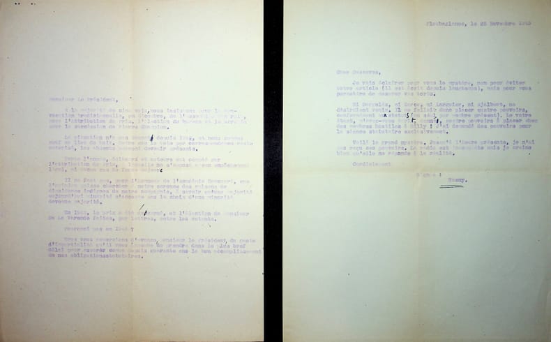Roland Dorgelès (1885-1973), écrivain, membre de l'Académie Goncourt. L.A.S., sd [été 1944, probablement avant août, 2p in-4. A l'écrivain membre de l'Académie Goncourt Léo Larguier (1878-1950). « Cher Larguier, Si j'apprends un jour que vous avez été frappé de la crainte des écrivains, je me consolerai en pensant que le rival ne vous est pas venu en m'écrivant. Paresseux devant l'encrier, craintif devant le chemin de fer : que vous reste-t-il. Dufy, toujours notre hôte, a pris du poids et des couleurs : avis aux blafards et aux efflanqués. Maintenant, parlons Goncourt. J'ai reçu : 1° une lettre du père Rosny m'exposant ses tourments au sujet de l'élection prochaine. "Sacha se montre intransigeant" me dit-il. Et il ne répond pas à mes lettres. Larguier non plus.." 2° une lettre de Billy à qui Descaves et Ajalbert ont conseillé d'intervenir auprès de nous deux pour que l'élection ait lieu en octobre ou début novembre, de façon que l'élu ait le temps de se préparer au vote pour le prix de décembre. J'ai répondu à Rosny - que jamais élection ne s'était annoncée si facile. Billy - devant passer dès le premier tout avec 5 voix - Et lui demande la sienne, ce qui ferait six. A Billy je réponds qu'effectivement on a toujours complété l'Académie avant décembre ; ce fut notamment mon cas. Et je lui dis que je vous écris dans ce sens. En qualité de vice-président, vous pourriez écrire à Rosny, avec l'assentiment des quatre mousquetaires dont un auvergnat, pour lui demander que l'élection ait lieu, conformément à la tradition, bien avant l'attribution du prix. Si nous sommes d'accord, tout ira bien. Les deux mains Roland Dorgelès ». [445]
