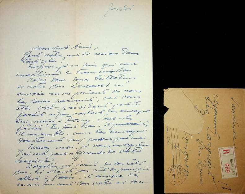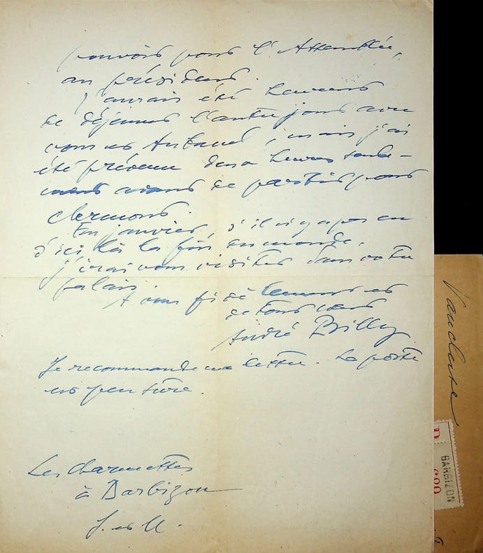 André Billy (1882-1971), écrivain, membre de l'Académie Goncourt. L.A.S. + enveloppe, Barbizon, 18 novembre 1943, 2p in-4. A l'écrivain membre de l'Académie Goncourt Léo Larguier (1878-1950). « Mon cher ami, Quel rôle est le mien dans tout cela ? Enfin, je ne suis qu'une machine de transmission. Voici donc deux bulletins de vote que Descaves m'envoie en me priant de vous les faire parvenir, car vous êtes vice-président, et il paraît ne pas vouloir les envoyer lui-même à Rosny. Sont-ils fâchés ? En tout cas, il pourrait, il me semble, vous les envoyer directement sans passer par moi. Excusez-moi, je vous en supplie. J'ai une peur affreuse de votre sourire. Dorgelès m'écrit de son côté que, n'étant pas sûr de pouvoir aller à Paris, il envoie dès maintenant son vote et son pouvoir pour l'Assemblée, au président. J'aurais été heureux de déjeuner l'autre jour avec vous au tribunal, mais j'ai été prévenu deux heures seulement avant de partir pour Clermont. Fin janvier, s'il n'y a pas eu d'ici là la fin du monde, j'irai vous visiter dans votre palais. A vous fidèlement et de tout coeur. André Billy Je recommande ma lettre. La poste est peu sûre ». [447]