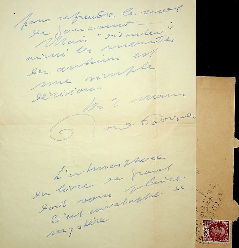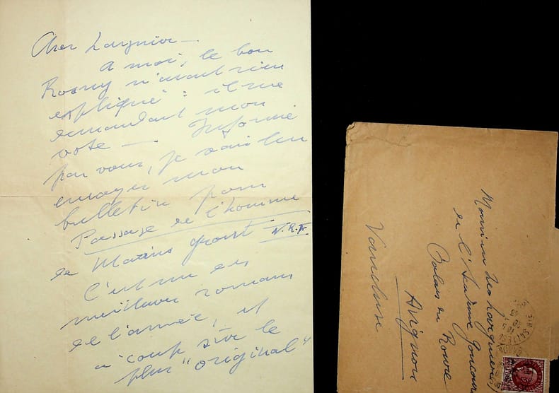 Roland Dorgelès (1885-1973), écrivain, membre de l'Académie Goncourt. L.A.S. + enveloppe, Salies du Salat, 20 décembre 1943, 2p in-8. A l'écrivain membre de l'Académie Goncourt Léo Larguier (1878-1950). « Cher Larguier, A moi, le bon Rosny n'avait rien expliqué : il me demandait mon vote. Informé par vous, je vais lui envoyer mon bulletin pour Passage de l'homme de Marius Grout N.R.F. C'est un des meilleurs romans de l'année, et à coup sûr le plus « original » pour reprendre le mot de Goncourt. Mais « discuter » ainsi les mérites des auteurs est une simple dérision. Les 2 mains. Roland Dorgelès L'atmosphère du livre de Grout doit vous plaire. C'est une enveloppe de mystère ». [447]