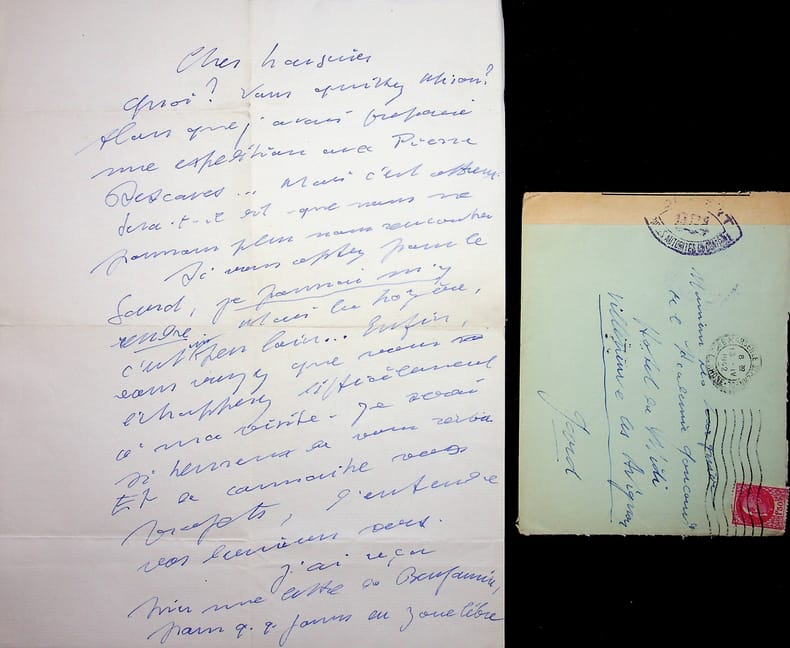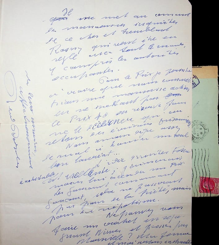 Roland Dorgelès (1885-1973), écrivain, membre de l'Académie Goncourt. L.A.S. + enveloppe, sd [13 avril 1942 ?], 2p in-4. A l'écrivain membre de l'Académie Goncourt Léo Larguier (1878-1950). « Cher Larguier, Quoi ? Vous quittez [?] ? Plan que j'avais préparé une expédition avec Pierre Descaves. mais c'est affreux. Sera-t-il dit que nous ne pourrons plus nous rencontrer. Si vous allez par le Gard, je pourrai m'y rendre, mais la Lozère, c'est un peu loin. Enfin, vous verrez que vous échapperez difficilement à ma visite. Je serai si heureux de vous revoir. Et de connaître vos projets, d'entendre vos derniers vers. J'ai reçu hier une lettre de Benjamin, parti q.q. jours en zone libre. Il me met au courant des manoeuvres inquiètes de ce cher et tremblant Rosny qui veut être en règle avec tout le monde, y compris les autorités occupantes. Pour le Prix, je persiste à croire que nous commettrions une mauvaise action en ne mettant pas le Prix 40 en réserve pour ne le décerner qu'au retour des écrivains prisonniers. Nous avons déjà assez de mal à trouver un seul bon lauréat. L'idée d'inviter [François] Fosca à notre table est excellente ; j'aimerais moins lui accorder un Prix. Les Goncourt [.] Goncourt, cela ne passerait pas pour de la piété, mais pour du népotisme. Ne pouvez-vous faire un crochet en regagnant Nîmes et passer par Marseille ? Ma femme et moi serions enchantés. Des deux mains, affectueusement. Roland Dorgelès ». [447]
